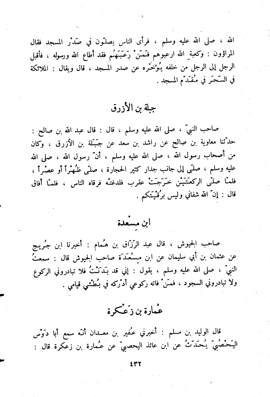 قَالَ: قَالَ عَبْدُ اللَّهِ بْنُ صَالِحٍ: حَدَّثَنَا مُعَاوِيَةُ بْنُ صَالِحٍ، عَنْ رَاشِدِ بْنِ سَعْدٍ، عَنْ جَبَلَةَ بْنِ الْأَزْرَقِ - وَكَانَ مِنْ أَصْحَابِ رَسُولِ اللَّهِ صلّى الله عليه وسلم - أَنَّ رَسُولَ اللَّهِ صلّى الله عليه وسلم صَلَّى إِلَى جَانِبِ جِدَارٍ كَثِيرِ الْحِجَارَةِ، صَلَّى ظُهْرًا أَوْ عَصْرًا، فَلَمَّا صَلَّى الرَّكْعَتَيْنِ خَرَجَتْ عَقْرَبٌ فَلَدَغَتْهُ، فَرَقَاهُ النَّاسُ، فَلَمَّا أَفَاقَ قَالَ: «§إِنَّ اللَّهَ شَفَانِي، وَلَيْسَ بِرُقْيَتِكُمْ»