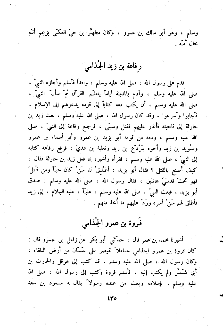 §رِفَاعَةُ بْنُ زَيْدٍ الْجُذَامِيُّ قَدِمَ عَلَى رَسُولِ اللَّهِ صلّى الله عليه وسلم وَافِدًا، فَأَسْلَمَ، وَأَجَازَهُ النَّبِيُّ صلّى الله عليه وسلم، وَأَقَامَ بِالْمَدِينَةِ أَيَّامًا يَتَعَلَّمُ الْقُرْآنَ، ثُمَّ سَأَلَ النَّبِيَّ صلّى الله عليه وسلم أَنْ يَكْتُبَ مَعَهُ كِتَابًا إِلَى قَوْمِهِ يَدْعُوهُمْ إِلَى الْإِسْلَامِ، فَأَجَابُوا وَأَسْرَعُوا، وَقَدْ كَانَ رَسُولُ اللَّهِ صلّى الله عليه وسلم بَعَثَ زَيْدَ بْنَ حَارِثَةَ إِلَى نَاحِيَتِهِ، فَأَغَارَ عَلَيْهِمْ، فَقَتَلَ وَسَبَى، فَرَجَعَ رِفَاعَةُ إِلَى النَّبِيِّ صلّى الله عليه وسلم، وَمَعَهُ مِنْ قَوْمِهِ أَبُو يَزِيدَ بْنُ عَمْرٍو، وَأَبُو أَسْمَاءَ بْنُ عَمْرٍو، وَسُوَيْدُ بْنُ زَيْدٍ، وَأَخُوهُ بَرْذَعُ بْنُ زَيْدٍ، وَثَعْلَبَةُ بْنُ عَدِيٍّ، فَرَفَعَ رِفَاعَةُ كِتَابَهُ إِلَى النَّبِيِّ صلّى الله عليه وسلم، فَقَرَأَهُ وَأَخْبَرَهُ بِمَا فَعَلَ زَيْدُ بْنُ حَارِثَةَ، فَقَالَ: «كَيْفَ أَصْنَعُ بِالْقَتْلَى» ؟ فَقَالَ أَبُو يَزِيدَ: أَطْلِقْ لَنَا مَنْ كَانَ حَيًّا، وَمَنْ قُتِلَ فَهُوَ تَحْتَ قَدَمَيَّ هَاتَيْنِ فَقَالَ رَسُولُ اللَّهِ صلّى الله عليه وسلم: «صَدَقَ أَبُو يَزِيدَ» ، فَبَعَثَ النَّبِيُّ صلّى الله عليه وسلم عَلِيًّا عَلَيْهِ السَّلَامُ إِلَى زَيْدٍ، فَأَطْلَقَ لَهُمْ مَنْ أَسَرَهُ، وَرَدَّ عَلَيْهِمْ مَا أَخَذَ مِنْهُمْ