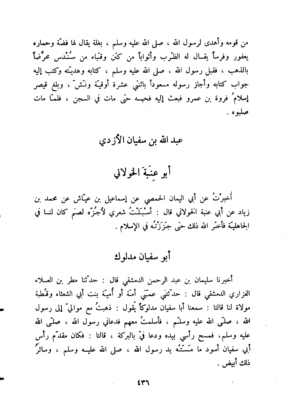 أَخْبَرَنَا سُلَيْمَانُ بْنُ عَبْدِ الرَّحْمَنِ الدِّمَشْقِيُّ، قَالَ: حَدَّثَنَا مَطَرُ بْنُ الْعَلَاءِ الْفَزَارِيُّ الدِّمَشْقِيُّ، قَالَ: حَدَّثَتْنِي عَمَّتِي أَمَةُ أَوْ أُمَيَّةُ بِنْتُ أَبِي الشَّعْثَاءِ، وَقُطْبَةُ مَوْلَاةٌ لَنَا قَالَتَا: سَمِعْنَا أَبَا سُفْيَانَ، مَدْلُوكًا يَقُولُ: «ذَهَبْتُ مَعَ مَوَالِيَّ إِلَى رَسُولِ اللَّهِ صلّى الله عليه وسلم، فَأَسْلَمْتُ مَعَهُمْ، §فَدَعَانِي رَسُولُ اللَّهِ صلّى الله عليه وسلم، فَمَسَحَ رَأْسِي بِيَدِهِ، وَدَعَا فِيَّ بِالْبَرَكَةِ» ، قَالَتَا: «فَكَانَ مُقَدَّمُ رَأْسِ أَبِي سُفْيَانَ أَسْوَدَ مَا مَسَّتْهُ يَدُ رَسُولِ اللَّهِ صلّى الله عليه وسلم، وَسَائِرُ ذَلِكَ أَبْيَضُ»