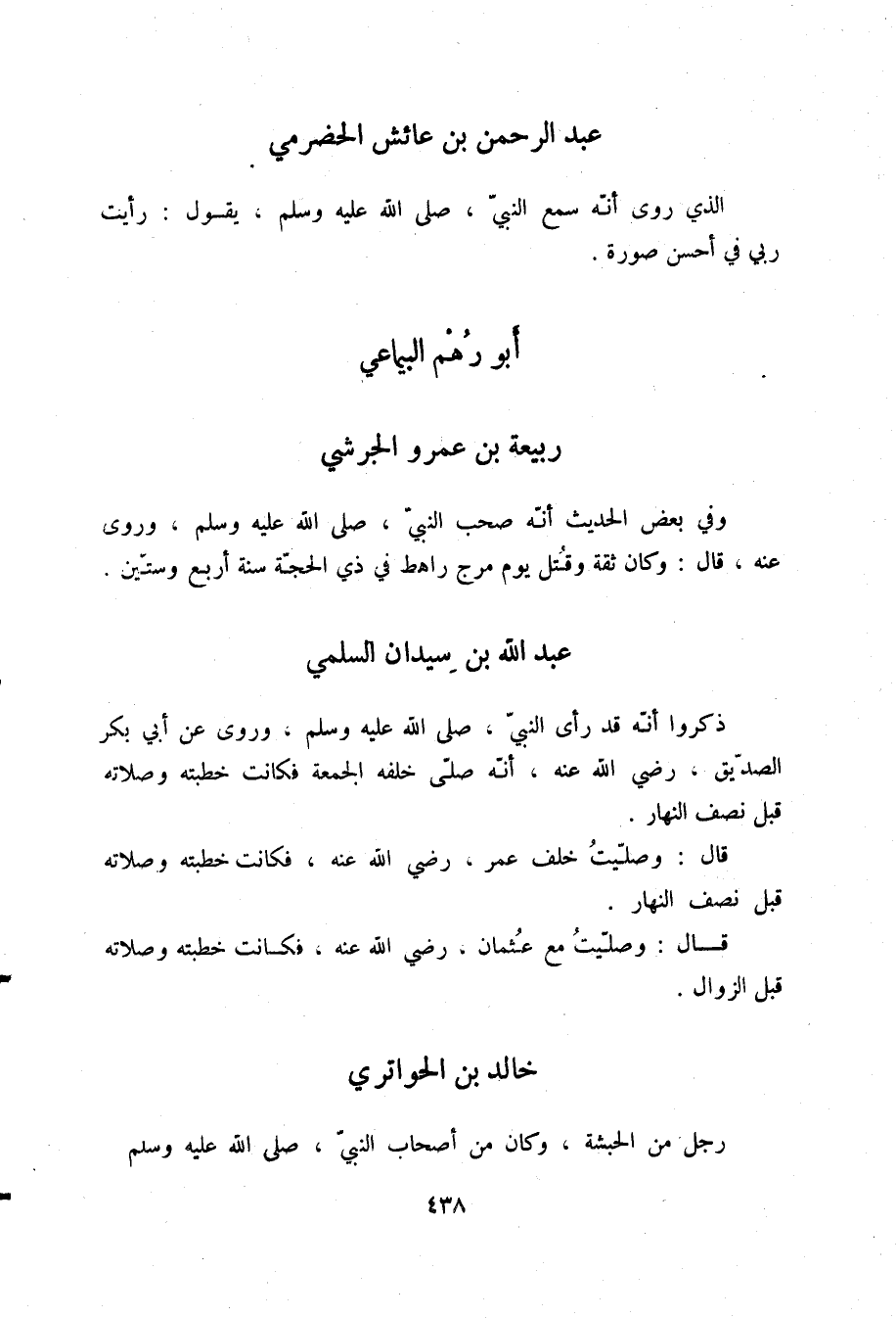 §عَبْدُ اللَّهِ بْنُ سِيدَانَ السُّلَمِيُّ ذَكَرُوا أَنَّهُ قَدْ رَأَى النَّبِيَّ صلّى الله عليه وسلم، وَرَوَى عَنْ أَبِي بَكْرٍ الصِّدِّيقِ رَضِيَ اللَّهُ عَنْهُ أَنَّهُ صَلَّى خَلْفَهُ الْجُمُعَةَ، فَكَانَتْ خُطْبَتُهُ وَصَلَاتُهُ قَبْلَ نِصْفِ النَّهَارِ قَالَ: «وَصَلَّيْتُ خَلْفَ عُمَرَ رَضِيَ اللَّهُ عَنْهُ، فَكَانَتْ خُطْبَتُهُ وَصَلَاتُهُ قَبْلَ نِصْفِ النَّهَارِ» ، قَالَ: «وَصَلَّيْتُ مَعَ عُثْمَانَ رَضِيَ اللَّهُ عَنْهُ، فَكَانَتْ خُطْبَتُهُ وَصَلَاتُهُ قَبْلَ الزَّوَالِ»