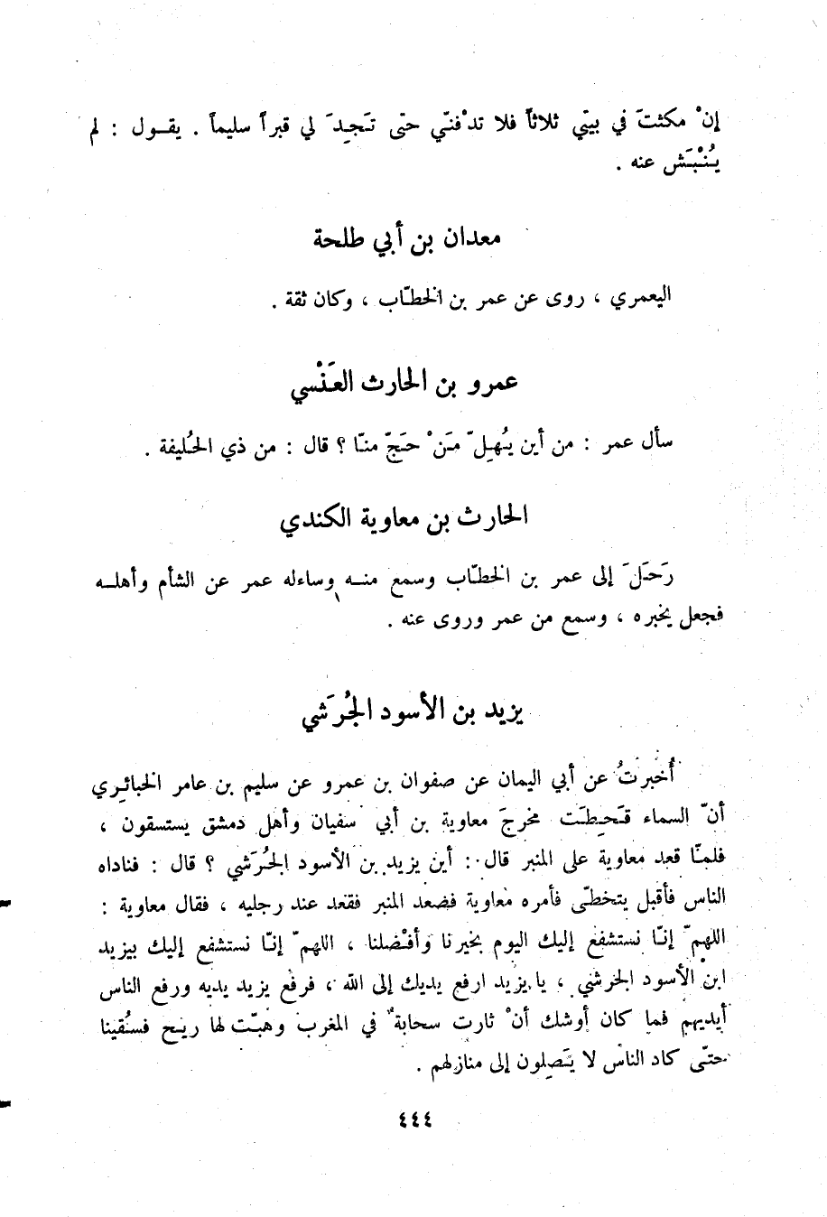 أُخْبِرْتُ عَنْ أَبِي الْيَمَانِ، عَنْ صَفْوَانَ بْنِ عَمْرٍو، عَنْ سُلَيْمِ بْنِ عَامِرٍ الْخَبَائِرِيِّ، أَنَّ السَّمَاءَ قَحِطَتْ مَخْرَجَ مُعَاوِيَةَ بْنِ أَبِي سُفْيَانَ وَأَهْلُ دِمَشْقَ يَسْتَسْقُونَ، فَلَمَّا قَعَدَ مُعَاوِيَةُ عَلَى الْمِنْبَرِ قَالَ: " أَيْنَ يَزِيدُ بْنُ الْأَسْوَدِ الْجُرَشِيُّ؟ قَالَ: فَنَادَاهُ النَّاسُ، فَأَقْبَلَ يَتَخَطَّى، فَأَمَرَهُ مُعَاوِيَةُ، فَصَعِدَ الْمِنْبَرَ، فَقَعَدَ عِنْدَ رِجْلَيْهِ، فَقَالَ مُعَاوِيَةُ: «§اللَّهُمَّ إِنَّا نَسْتَشْفِعُ إِلَيْكَ الْيَوْمَ بِخَيْرِنَا وَأَفْضَلِنَا، اللَّهُمَّ إِنَّا نَسْتَشْفِعُ إِلَيْكَ بِيَزِيدَ بْنِ الْأَسْوَدِ الْجُرَشِيِّ، يَا يَزِيدُ، ارْفَعْ يَدَيْكَ إِلَى اللَّهِ» ، فَرَفَعَ يَزِيدُ يَدَيْهِ، وَرَفَعَ النَّاسُ أَيْدِيَهُمْ، فَمَا كَانَ أَوْشَكَ أَنْ ثَارَتْ سَحَابَةٌ فِي الْمَغْرِبِ، وَهَبَّتْ لَهَا رِيحٌ، فَسُقِينَا حَتَّى كَادَ النَّاسُ لَا يَصِلُونَ إِلَى مَنَازِلِهِمْ