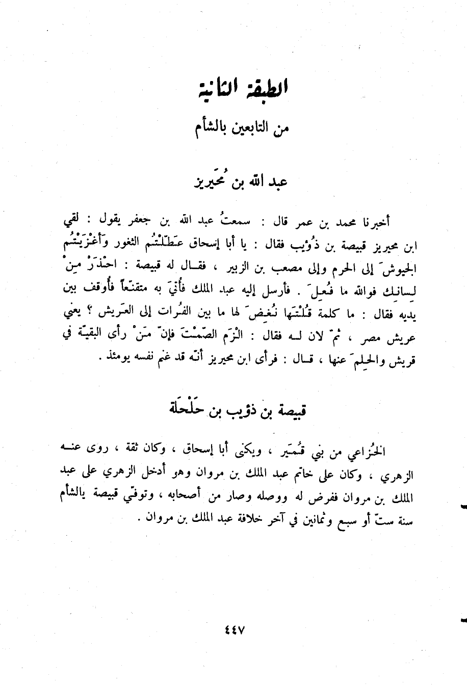 أَخْبَرَنَا مُحَمَّدُ بْنُ عُمَرَ، قَالَ: سَمِعْتُ عَبْدَ اللَّهِ بْنَ جَعْفَرٍ، يَقُولُ: لَقِيَ ابْنُ مُحَيْرِيزٍ قَبِيصَةَ بْنَ ذُؤَيْبٍ، فَقَالَ: «يَا أَبَا إِسْحَاقَ، §عَطَّلْتُمِ الثُّغُورَ، وَأَغْزَيْتُمُ الْجُيُوشَ إِلَى الْحَرَمِ، وَإِلَى مُصْعَبِ بْنِ الزُّبَيْرِ» ، فَقَالَ لَهُ قَبِيصَةُ: «احْذَرْ مِنْ لِسَانِكَ، فَوَاللَّهِ مَا فُعِلَ» ، فَأَرْسَلَ إِلَيْهِ عَبْدُ الْمَلِكِ، فَأُتِيَ بِهِ مُتَقَنِّعًا، فَأُوقِفَ بَيْنَ يَدَيْهِ، فَقَالَ: «مَا كَلِمَةٌ قُلْتَهَا نُغِضَ لَهَا مَا بَيْنَ الْفُرَاتِ إِلَى الْعَرِيشِ يَعْنِي عَرِيشَ مِصْرَ» ثُمَّ لَانَ لَهُ، فَقَالَ: «الْزَمِ الصَّمْتَ، فَإِنَّ مَنْ رَأَى الْبَقِيَّةَ فِي قُرَيْشٍ وَالْحِلْمَ عَنْهَا» ، قَالَ: «فَرَأَى ابْنُ مُحَيْرِيزٍ أَنَّهُ قَدْ غَنِمَ نَفْسَهُ يَوْمَئِذٍ»
