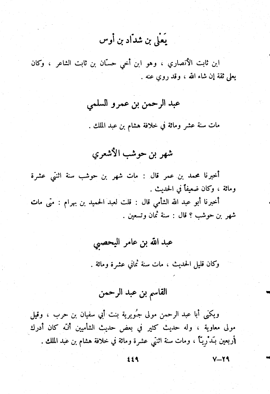 أَخْبَرَنَا أَبُو عَبْدِ اللَّهِ الشَّامِيُّ قَالَ: قُلْتُ لِعَبْدِ الْحَمِيدِ بْنِ بَهْرَامَ: «§مَتَى مَاتَ شَهْرُ بْنُ حَوْشَبٍ؟» قَالَ: «سَنَةَ ثَمَانٍ وَتِسْعِينَ»