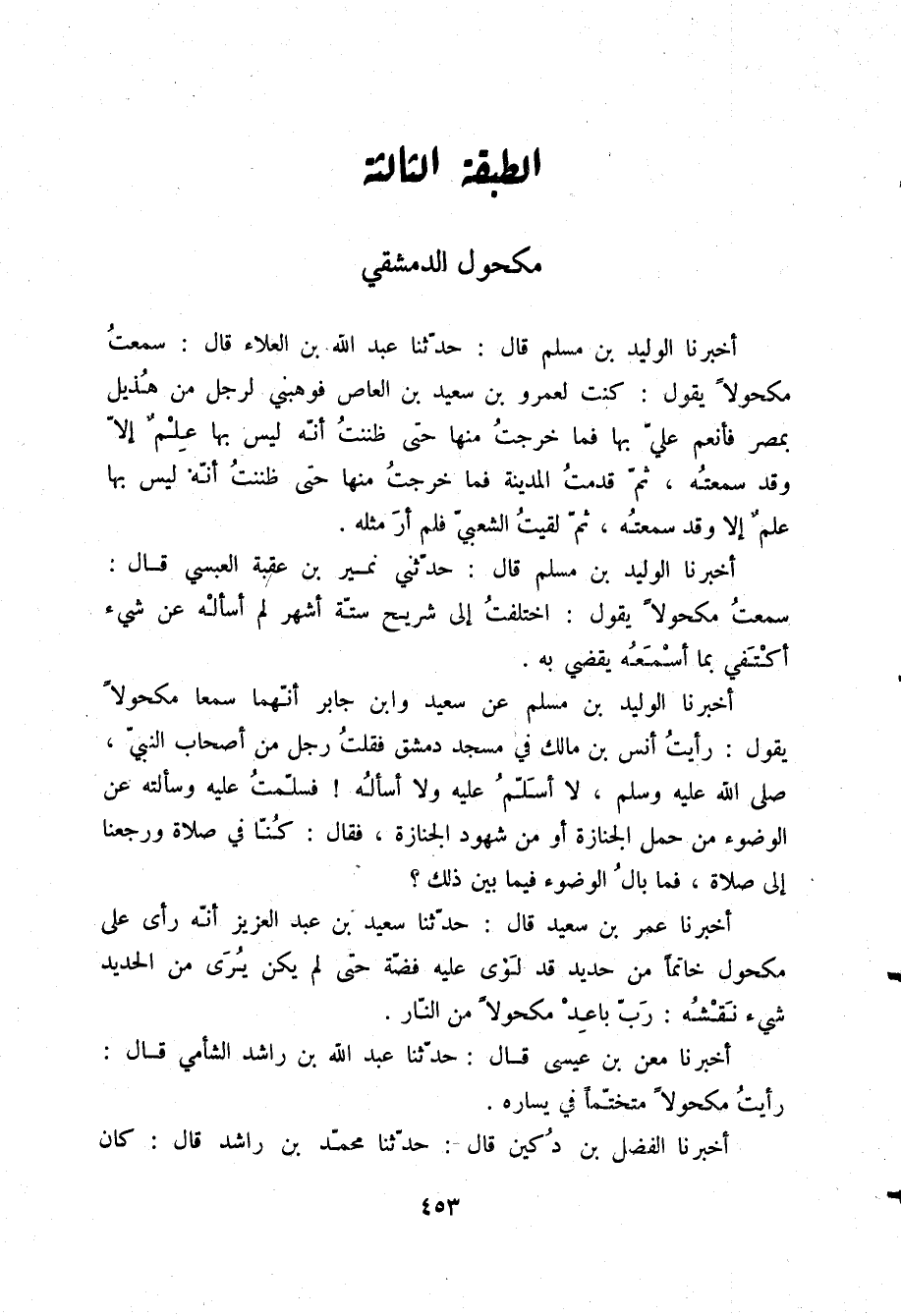 أَخْبَرَنَا الْوَلِيدُ بْنُ مُسْلِمٍ، قَالَ: حَدَّثَنَا عَبْدُ اللَّهِ بْنُ الْعَلَاءِ، قَالَ: سَمِعْتُ مَكْحُولًا، يَقُولُ: «§كُنْتُ لِعَمْرِو بْنِ سَعِيدِ بْنِ الْعَاصِ، فَوَهَبَنِي لِرَجُلٍ مِنْ هُذَيْلٍ بِمِصْرَ، فَأَنْعَمَ عَلَيَّ بِهَا، فَمَا خَرَجْتُ مِنْهَا حَتَّى ظَنَنْتُ أَنَّهُ لَيْسَ بِهَا عِلْمُ إِلَّا وَقَدْ سَمِعْتُهُ، ثُمَّ قَدِمْتُ الْمَدِينَةَ، فَمَا خَرَجْتُ مِنْهَا حَتَّى ظَنَنْتُ أَنَّهُ لَيْسَ بِهَا عِلْمٌ إِلَّا وَقَدْ سَمِعْتُهُ، ثُمَّ لَقِيتُ الشَّعْبِيَّ، فَلَمْ أَرَ مِثْلَهُ»
