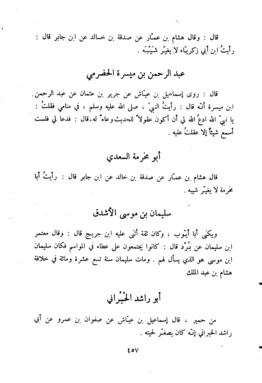 قَالَ: وَقَالَ هِشَامُ بْنُ عَمَّارٍ، عَنْ صَدَقَةَ بْنِ خَالِدٍ، عَنِ ابْنِ جَابِرٍ قَالَ: «§رَأَيْتُ ابْنَ أَبِي زَكَرِيَّا لَا يُغَيِّرُ شَيْبَهُ»