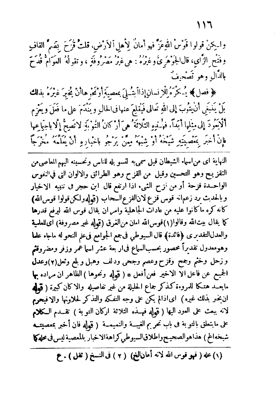النهاية أي من أسماء الشيطان قيل سمي به لتسويله للناس وتحسينه إليهم المعاصي من التقزيح وهو التحسين وقيل من القزح وهو الطرائق والألوان التي في النفوس الواحدة قزحة أو من قزح الشيء إذا ارتفع قال ابن حجر في تنبيه الأخيار وبالحديث يرد زعم أنه قوس قزع لأن القزع السحاب. قوله: (ولكن قولوا قوس الله) كأنه كره ما كانوا عليه من عادات الجاهلية وأمر أن يقال قوس الله ليرفع قدرها كما يقال بيت الله وقالوا قوس الله أمان من الغرق. قوله: (غير مصروفة) أي للعلمية والعدل التقديري.