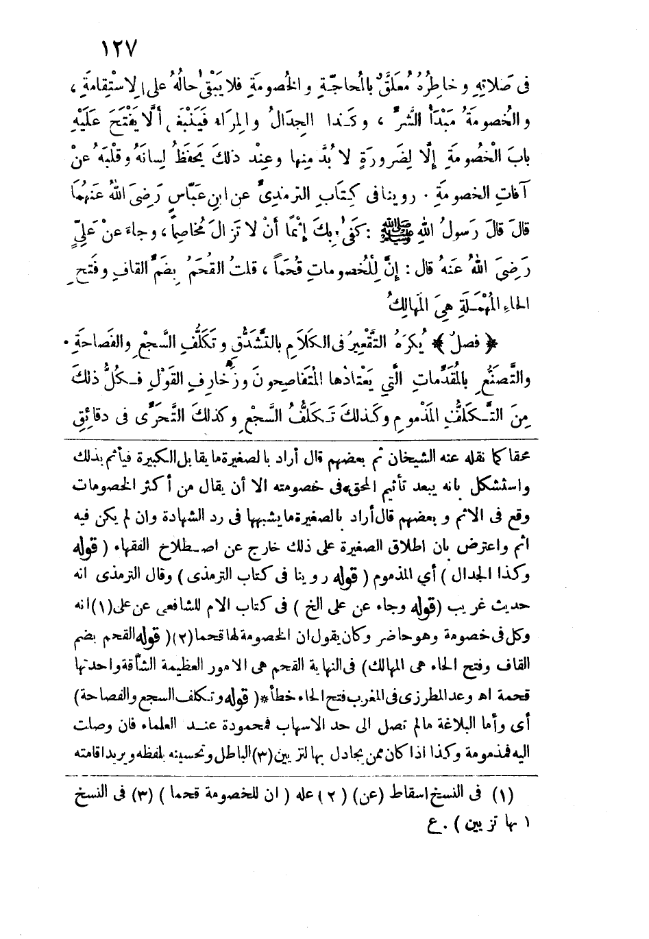 أنه متى وجد شيء مما نفاه حرمت الخصومة أما حرمتها في نصرة حجته بغير طريق الشرع فواضحة جلية وأما حرمتها فيما إذا نصرها بالشرع لكن مع إلداد وإسراف أو عناد أو زيادة لجاج على قدر الحاجة للإيذاء. وقوله: (لغير حاجة) ظاهره يجوز اللجاج للحاجة وكذا ما قبله لكن إن أدى اللدد وما بعده إلى نحو كذب أو تمويه باطل ضمه لحجته حرم ذكره ابن حجر في تنبيه الأخيار ثم قوله: "ففعله ليس حراماً" صريح في تحريم ما قبله من المراء والجدال بغير الحق وتحريم الخصومة إذا وجد فيها شيء مما نفاه، وقد وقع للجلال السيوطي في أذكار الأذكار أنه أطلق القول بكراهة المراء والجدال والخصومة ولم يقيدها بما ذكره المصنف وتعقبه ابن حجر بقوله كيف ساغ له الجزم بكراهة المراء مع تفسيره له بأنه ليس القصد منه إلا تحقير الغير الذي هو محرم إجماعاً فالصواب أنه حرام غليظ التحريم وبكراهة الجدال بغير حجة مع تفسير النووي له بأنه الجدال في مدافعة الحق والجدال بغير الحق في كل من هذين تحريمه ظاهر جلي فمن أظهر مذهبه بما يعلم بطلانه فقد جادل بغير حجة وارتكب عظيم الإثم لنصرته الباطل أو ترويجه على السامع وبكراهة الخصومة من غير قيد مع اشتراط النووي لعدم تحريمها أن ينصر حجته بطريق الشرع الخ. قوله: (ولكن الأولى تركه) فكثرة الخصومات عدها صاحب العدة من الصغائر وإن كان الشخص