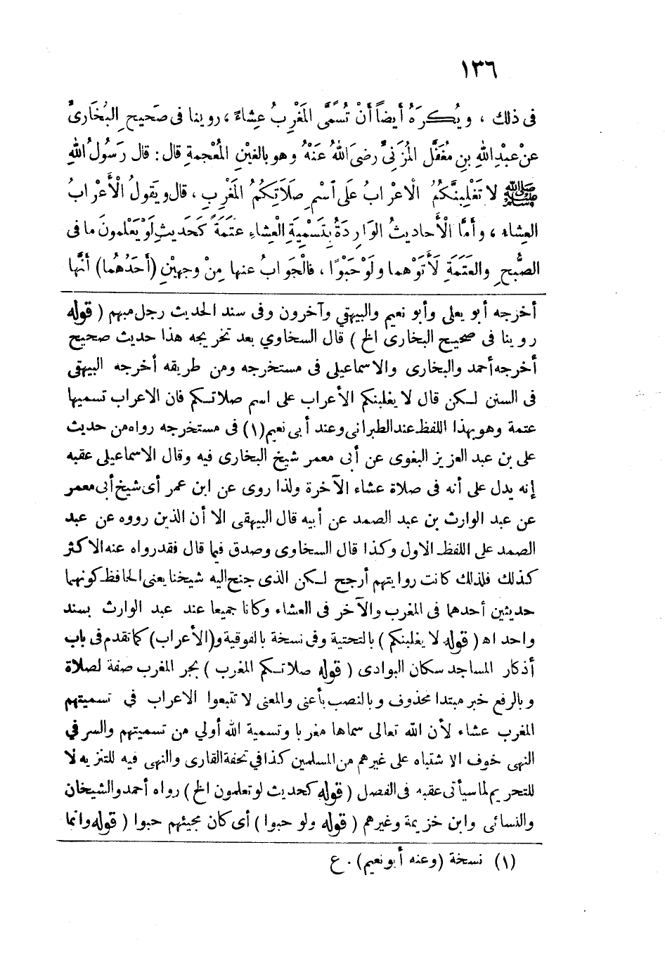 قوله: (روينا في صحيح البخاري الخ) قال السخاوي بعد تخريجه هذا حديث صحيح أخرجه أحمد والبخاري والإسماعيلي في مستخرجه ومن طريقه أخرجه البيهقي في السنن لكن قال لا يغلبنكم الأعراب على اسم صلاتكم فإن الأعراب تسميها عتمة وهو بهذا اللفظ عند الطبراني وعند أبي نعيم في مستخرجه رواه من حديث علي بن عبد العزيز البغوي عن أبي معمر شيخ البخاري فيه وقال الإسماعيلي عقبه إنه يدل على أنه في صلاة عشاء الآخرة ولذا روي عن ابن عمر أي شيخ أبي معمر عن عبد الوارث بن عبد الصمد عن أبيه قال البيهقي إلا أن الذين رووه عن عبد الصمد على اللفظ الأول وكذا قال السخاوي وصدق فيما قال فقد رواه عنه الأكثر كذلك فلذلك كانت روايتهم أرجح لكن الذي جنح إليه شيخنا يعني الحافظ كونهما حديثين أحدهما في المغرب والآخر في العشاء وكانا جميعاً عند عبد الوارث بسند واحد اهـ. قوله: (لا يغلبنكم) بالتحتية وفي نسخة بالفوقية و (الأعراب) كما تقدم في باب أذكار المساجد سكان البوادي. قوله: (صلاتكم المغرب) بجر المغرب صفة لصلاة وبالرفع خبر مبتدأ محذوف وبالنصب بأعني والمعنى لا تتبعوا الأعراب في تسميتهم المغرب عشاء لأن الله تعالى سماها مغرباً وتسمية الله أولى من تسميتهم والسر في النهي خوف الاشتباه على غيرهم من المسلمين كذا في تحفة القارئ والنهي فيه للتنزيه لا للتحريم لما سيأتي