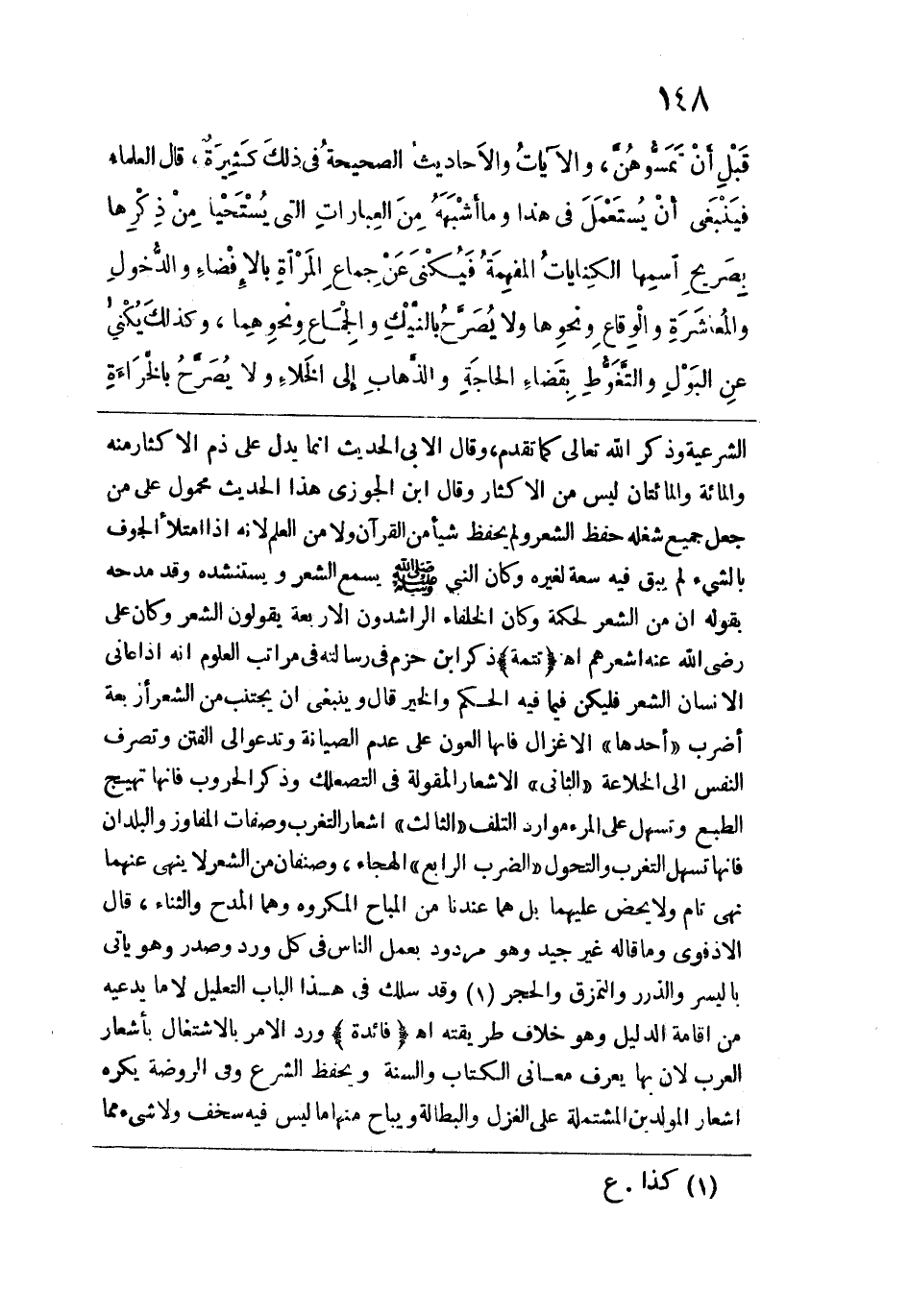 قال العلماء: فينبغي أن يُستعمَل في هذا وما أشبهه من العبارات التي يستحيي من ذكرها بصريح اسمها الكناياتُ المفهمةُ، فيكنَّى عن جماع المرأة بالإفضاء والدخول والمعاشرة والوقاع ونحوها ولا يصرَّح بالنَّيك والجماع ونحوهما، وكذلك يكنى عن البول والتغوُّط بقضاء الحاجة، والذهاب إلى الخلاء، ولا يصرَّح بالخِرَاءَةِ