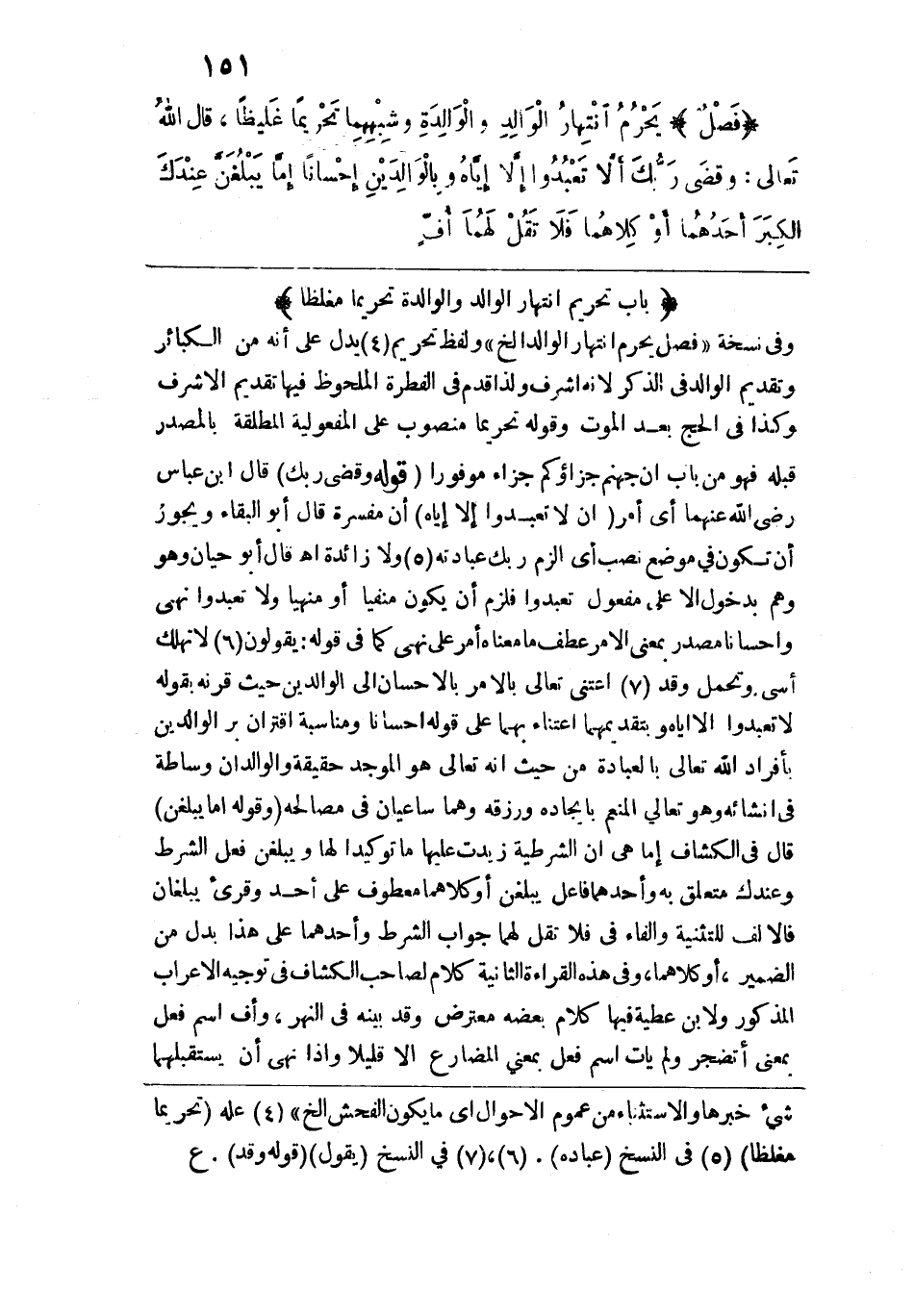 وفي نسخة "فصل يحرم انتهار الوالد الخ" ولفظ تحريم يدل على أنه من الكبائر وتقديم الوالد في الذكر لأنه أشرف ولذا قدم في الفطرة الملحوظ فيها تقديم الأشرف وكذا في الحج بعد الموت وقوله تحريماً منصوب على المفعولية المطلقة بالمصدر قبله فهو من باب أن جهنم جزاؤكم جزاءً موفوراً. قوله: {وَقَضَى رَبُّكَ} قال ابن عباس رضي الله عنهما أي أمر {أَلَّا تَعْبُدُوا إِلَّا إِيَّاهُ} أن مفسرة قال أبو البقاء ويجوز أن تكون في موضع نصب أي الزم ربك عبادته ولا زائدة اهـ. قال أبو حيان وهو وهم بدخول إلا على مفعول تعبدوا فلزم أن يكون منفياً أو منهياً ولا تعبدوا نهي وإحساناً مصدر بمعنى الأمر عطف ما معناه أمر على نهي كما في قوله: يقولون لا تهلك أسى وتحمل وقد اعتنى تعالى بالأمر بالإحسان إلى الوالدين حيث قرنه بقوله: {أَلَّا تَعْبُدُوا إِلَّا إِيَّاهُ} وبتقديمهما اعتناء بهما على قوله إحساناً ومناسبة اقتران بر الوالدين بإفراد الله تعالى بالعبادة من حيث إنه تعالى هو الموجد حقيقة والوالدان وساطة في إنشائه وهو تعالى المنعم بإيجاده ورزقه وهما ساعيان في مصالحه. وقوله: (إما يبلغن) قال في الكشاف إما هي أن الشرطية زيدت عليها ما توكيداً لها ويبلغن فعل الشرط وعندك متعلق به وأحدهما فاعل يبلغن أو كلاهما معطوف على أحد وقريء يبلغان فالألف للتثنية والفاء في {فَلَا تَقُلْ لَهُمَا}) جواب الشرط وأحدهما على هذا بدل من الضمير، أو كلاهما، وفي هذه المراءة الثانية كلام لصاحب الكشاف في توجيه الإعراب المذكور ولابن عطية فيها كلام بعضه معترض وقد بينه في النهر، وأف اسم فعل بمعنى أتضجر ولم يأت اسم فعل بمعنى المضارع إلا قليلاً وإذا نهى أن يستقبلهما