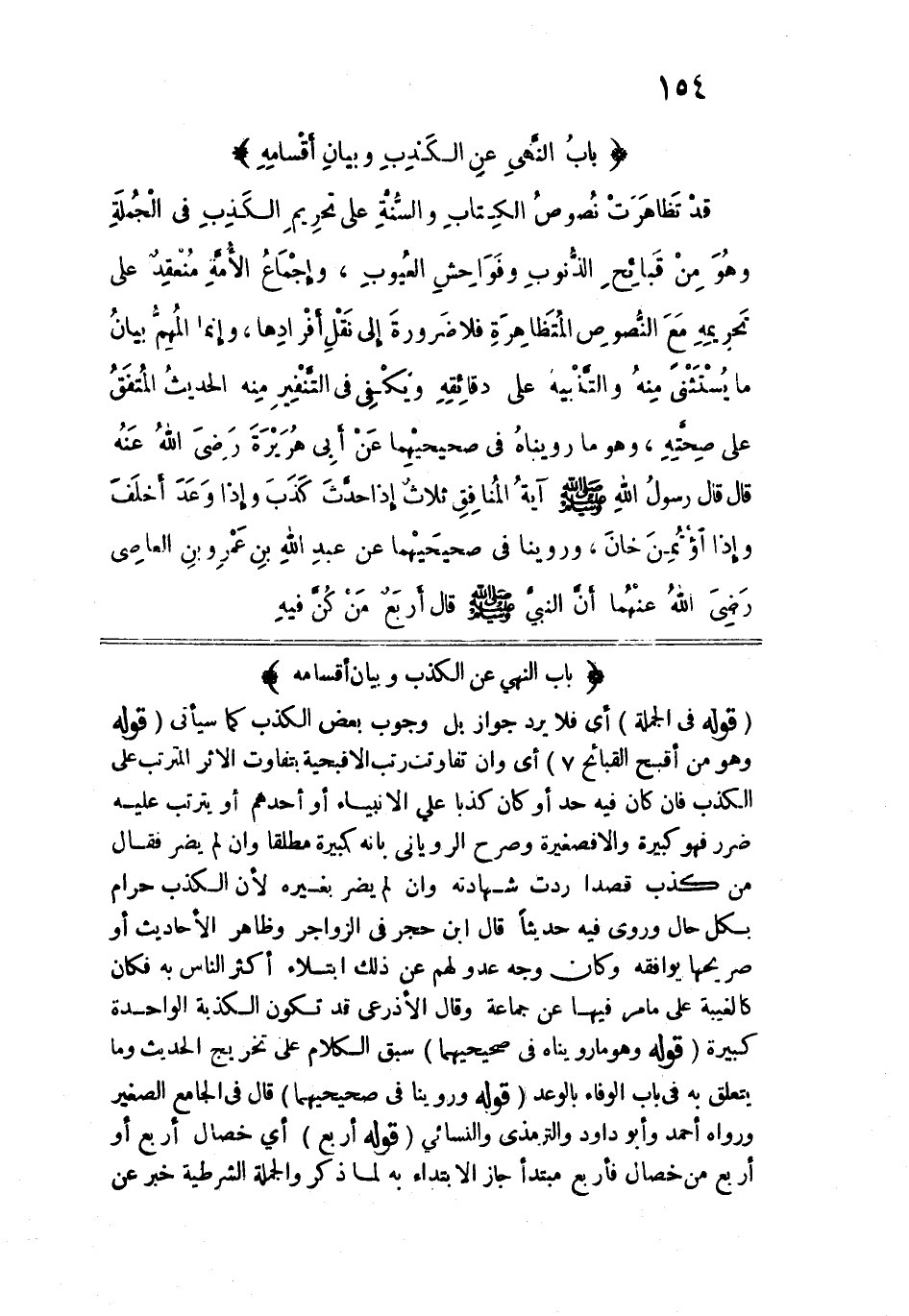 وروينا في "صحيحيهما" عن عبد الله بن عمرو بن العاص رضي الله عنهما أن النبي -صلى الله عليه وسلم- قال: "أربَعٌ مَنْ كُنَّ فيهِ