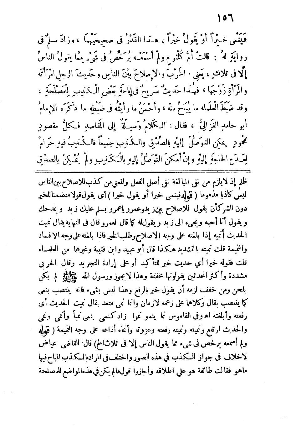 ظلم إذ لا يلزم من نفي المبالغة نفي أصل الفعل والمعنى من كذب للإصلاح بين النّاس ليس كاذباً مذموماً. قوله: (فينمي خيراً أو يقول خيراً) أي يقول قولاً متضمناً للخير دون الشر كأن يقول للإصلاح بين زيد وعمرو يا عمرو يسلم عليك زيد ويمدحك ويقول: أنا أحبه ويجيء إلى زيد ويقول له كما قال لعمرو قال في النهاية يقال نميت الحديث أنميه إذا بلغته على وجه الإصلاح وطلب الخير فإذا بلغته على وجه الإفساد والنميمة قلت نميته بالتشديد هكذا قال أبو عبيدة وابن قتيبة وغيرهما من العلماء قلت فقوله خيراً أي حديث خير للتأكيد أو على إرادة التجريد وقال الحربي مشددة وأكثر المحدثين يقولونها مخففة وهذا لا يجوز ورسول الله -صلى الله عليه وسلم- لم يكن يلحن ومن خفف لزمه أن يقول خير بالرفع وهذا ليس بشيء فإنه ينتصب بنمى كما ينتصب بقال وكلاهما على زعمه لازمان وإنما نمى متعد يقال نميت الحديث أي رفعته وأبلغته اهـ. وفي القاموس نما ينمو نمواً زاد كنمى ينمى نمياً ونمى والحديث ارتفع ونميته ونميته رفعته وعزوته وأنماه أذاعه على وجه النميمة. قوله: (ولم أسمعه يرخص في شيء مما يقول النَّاس إلا في ثلاث الخ) قال القاضي عياض لا خلاف في جواز الكذب في هذه الصور واختلف في المراد بالكذب المباح فيها ما هو فقالت طائفة هو على إطلاقه وأجازوا قول ما لم يكن في هذه المواضع للمصلحة