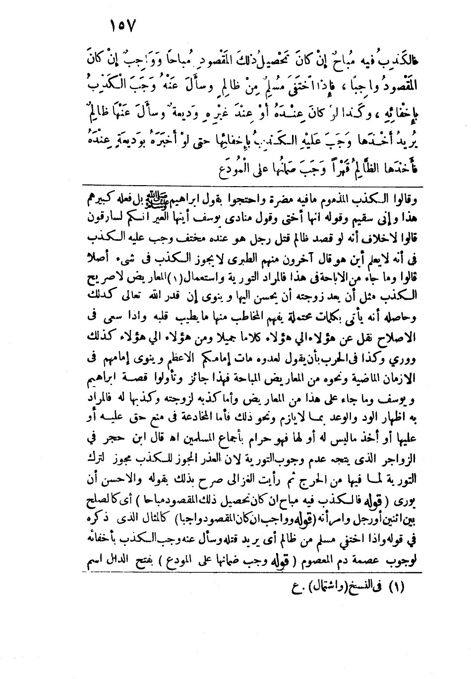 كلاماً جميلاً ومن هؤلاء إلى هؤلاء كذلك ووري وكذا في الحرب بأن يقول لعدوه مات إمامكم الأعظم وينوي إمامهم في الأزمان الماضية ونحوه من المعاريض المباحة فهذا جائز وتأولوا قصة إبراهيم ويوسف وما جاء على هذا من المعاريض وأما كذبه لزوجته وكذبها له فالمراد به إظهار الود والوعد بما لا يلزم ونحو ذلك فأما المخادعة في منع حق عليه أو عليها أو أخذ ما ليس له أو لها فهو حرام بإجماع المسلمين اهـ. قال ابن حجر في الزواجر الذي يتجه عدم وجوب التورية لأن العذر المجوز للكذب مجوز لترك التورية لما فيها من الحرج ثم رأيت الغزالي صرح بذلك بقوله والأحسن أن يوري.