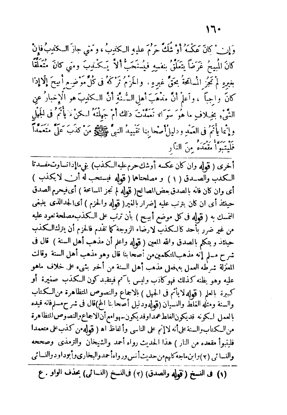 قوله: (واعلم أن مذهب أهل السنة) قال في شرح مسلم إنه مذهب المتكلمين من أصحابنا قال وهو مذهب أهل السنة وقالت المعتزلة شرطه العمل به فعلى مذهب أهل السنة من أخبر بشيء على خلاف ما هو عليه وهو يظنه كذلك فهو كاذب وليس بآثم فيتقيد كون الكذب صغيرة أو كبيرة بالعلم. قوله: (لا يأثم في الجهل) بالإجماع والنصوص المتظاهرة من الكتاب والسنة ومثله الغلط والنسيان. قوله: (ودليل أصحابنا الخ) قال في شرح مسلم فإنه قيده بالعمل لكونه في يكون الغلط عمداً وقد يكون سهواً مع أن الإجماع والنصوص المتظاهرة من الكتاب والسنة على أنه لا إثم على الناسي وألفاظ اهـ. قوله: (من كذب علي متعمداً فليتبوأ مقعده من النار) هذا الحديث رواه أحمد والشيخان والترمذي وصححه والنسائي وابن ماجه كلهم من حديث أنس ورواه أحمد والبخاري وأبو داود والنسائي