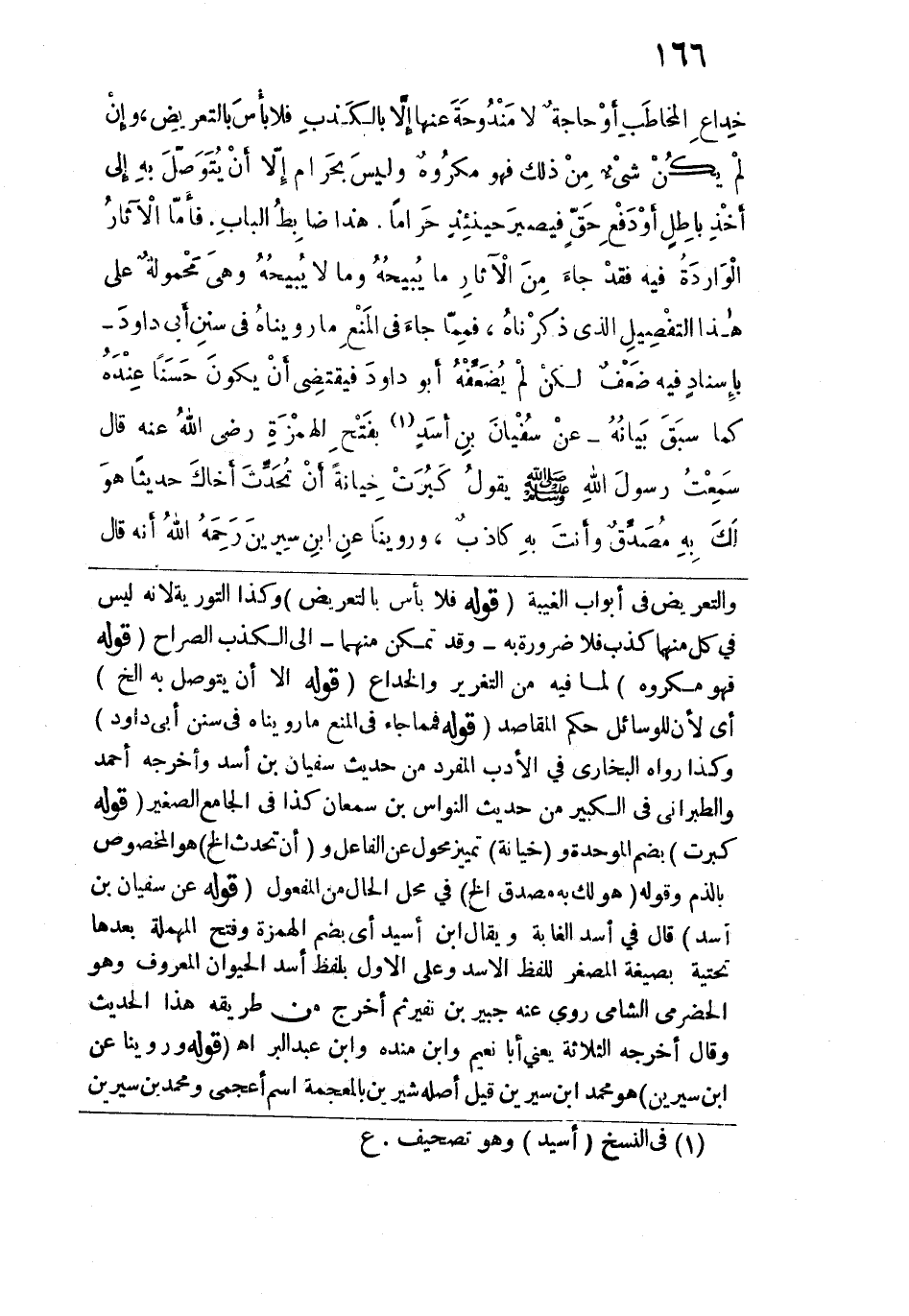 والتعريض في أبواب الغيبة. قوله: (فلا بأس بالتعريض) وكذا التورية لأنه ليس في كل منهما كذب فلا ضرورة به وقد تمكن منهما -إلى الكذب الصراح. قوله: (فهو مكروه) لما فيه من التغرير والخداع. قوله: (إلا أن يتوصل به الخ) أي لأن للوسائل حكم المقاصد. قوله: (فمما جاء في المنع ما رويناه في سنن أبي داود) وكذا رواه البخاري في الأدب المفرد من حديث سفيان بن أسد وأخرجه أحمد والطبراني في الكبير من حديث النواس بن سمعان كذا في الجامع الصغير. قوله: (كبرت) بضم الموحدة و (خيانة) تمييز محول عن الفاعل و (أن تحدث الخ) هو المخصوص بالذم. وقوله: (هو لك به مصدق الخ) في محل الحال من المفعول. قوله: (عن سفيان بن أسد) قال في أسد الغابة ويقال ابن أسيد أي بضم