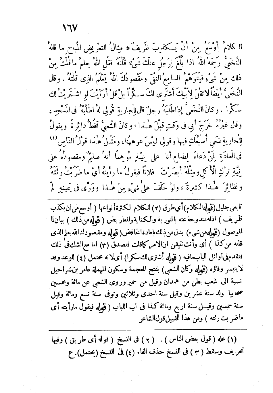الكلام أوسعُ من أن يكذِبَ ظريفٌ. مثال التعريض المباح ما قاله النخعي رحمه الله: إذا بَلَغَ الرجلَ عنك شيءٌ قلتَه فقل: الله يعلم ما قلتُ من ذلك من شيء، فيتوهم السامع النفي، ومقصودك: الله يعلم الذي قلته. وقال النخعي أيضاً: لا تقل لابنك: أشتري لك سُكَّراً، بل قل: أرأيتَ لو اشتريتُ لك سُكَّراً. وكان النخعي إذا طلبه رجل قال للجارية: قولي له: اطلبه في المسجد. وقال غيره: خرج أبي في وقت قبل هذا. وكان الشعبي يخط دائرة ويقول للجارية: ضعي أصبعك فيها وقولي: ليس هو ها هنا. ومثل هذا قول النّاس في العادة لمن دعاه لطعام: أنا على نية، موهماً أنه صائم، ومقصوده: على نية ترك الأكل، ومثله: أبصرتَ فلاناً؟ فيقول ما رأيته، أي: ما ضربت رِئَتَه، ونظائر هذا كثيرة. ولو حلف على شيء من هذا، وورَّى في يمينه، لم