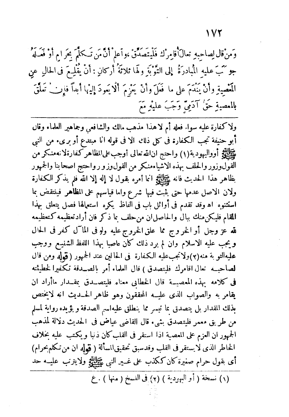 ولا كفارة عليه سواء فعله أم لا هذا مذهب مالك والشافعي وجماهير العلماء وقال أبو حنيفة تجب الكفارة في كل ذلك إلا في قوله أنا مبتدع أو بريء من النبي -صلى الله عليه وسلم- أو واليهودية واحتج أن الله تعالى أوجب على المظاهر كفارة لأنه منكر من القول وزور والحلف بهذه الأشياء منكر من القول وزور واحتج أصحابنا والجمهور بظاهر هذا الحديث فإنه -صلى الله عليه وسلم- إنما أمره بقول لا إله إلا الله فلم يذكر الكفارة ولأن الأصل عدمها حتى يثبت فيها شرع وأما قياسهم على المظاهر فينتقض بما استثنوه اهـ. وقد تقدم في أوائل باب في ألفاظ يكره استعمالها. فصل يتعلق بهذا المقام فليكن منك ببال والحاصل أن من حلف بما ذكر فإن أراد تعظيمه كتعظيمه لله عزّ وجلّ أو الخروج مما علق الخروج عليه ولو في المآل كفر في الحال ويجب عليه الإسلام وإن لم يرد ذلك كان عاصياً بهذا اللفظ الشنيع ووجب عليه التوبة منه ولا تجب عليه الكفارة في الحالين عند الجمهور. قوله: (ومن قال لصاحبه تعال أقامرك فليتصدق) قال العلماء أمر بالصدقة تكفيراً لخطيئته في كلامه بهذه المعصية قال الخطابي معناه فليتصدق بمقدار ما أراد أن يقامر به والصواب الذي عليه المحققون وهو ظاهر الحديث أنه لا يختص بذلك المقدار بل يتصدق بما تيسر مما ينطلق عليه اسم الصدقة ويؤيده رواية لمسلم من طريق معمر فليتصدق بشيء قال القاضي عياض في الحديث دلالة لمذهب الجمهور أن العزم على المعصية إذا استقر في القلب كان ذنباً ويكتب عليه بخلاف الخاطر الذي لا يستقر في القلب وقد سبق تحقيق المسألة. قوله: (إن من تكلم بحرام) أي بقول حرام صغيرة كان ككذب على غير النبي -صلى الله عليه وسلم- ولا يترتب عليه حد