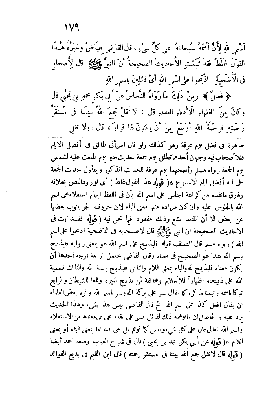 ظاهرة في فضل يوم عرفة وهو كذلك ولو قال امرأتي طالق في أفضل الأيام فللأصحاب فيه وجهان أحدهما تطلق يوم الجمعة لحديث خير يوم طلعت عليه الشمس يوم الجمعة رواه مسلم وأصحهما يوم عرفة للحديث المذكور ويتأول حديث الجمعة على أنه أفضل أيام الأسبوع. قوله: (هذا القول غلط) أي لورود النص بخلافه وفارق ما تقدم من كراهة اجلس على اسم الله بأن في اللفظ إيهام استعلاء على اسم الله بالجلوس عليه وإن كان مراده منها معنى الباء لأن حروف الجر ينوب بعضها عن بعض إلا أن اللفظ بشع وذلك مفقود فيما نحن فيه. قوله: (فقد ثبت في الأحاديث الصحيحة أن النبي -صلى الله عليه وسلم- قال لأصحابه في الأضحية اذبحوا على اسم الله) رواه مسلم قال المصنف قوله فليذبح على اسم الله هو بمعنى رواية فليذبح باسم الله هذا هو الصحيح في معناه وقال القاضي يحتمل أربعة أوجه أحدها أن يكون معناه فليذبح لله والباء بمعنى اللام والثاني فليذبح بسنة الله والثالث بتسمية الله على ذبيحته إظهاراً للإسلام ومخالفة لمن يذبح لغيره وقمعاً للشيطان والرابع تبركاً