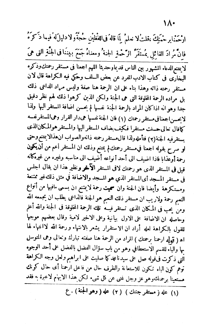 لا يمتنع الدعاء المشهور بين النّاس قديماً وحديثاً اللهم اجمعنا في مستقر رحمتك وذكره البخاري في كتاب الأدب المفرد عن بعض السلف وحكي فيه الكراهة قال: لأن مستقر رحمته ذاته وهذا بناء على أن الرحمة هنا صفة وليس مراد الداعي ذلك بل مراده الرحمة المخلوقة التي هي الجنة ولكن الذين كرهوا ذلك لهم نظر دقيق جداً وهو أنه إذا كان المراد بالرحمة الجنة نفسها لم يحسن إضافة المستقر إليها ولذا لا يحسن أجمعنا في مستقر رحمتك فإن الجنة نفسها هي دار القرار وهي المستقر نفسه كما قال تعالى: {حَسُنَتْ مُسْتَقَرًّا} فكيف يضاف المستقر إليها والمستقر هو المكان الذي يستقر فيه الجنة فتأمله ولذا قال مستقر رحمته ذاته والصواب أن هذا لا يمتنع وحتى لو صرح بقوله أجمعنا في مستقر رحمتك لم يمتنع وذلك أن المستقر أعم من أن يكون رحمة أو عذاباً فإذا أضيف إلى أحد أنواعه أضيف إلى مناسبه وغيره من غيره كأنه قيل في المستقر الذي هو رحمتك لا في المستقر الآخر ونظير هذا أن يقال اجلس في مستقر المسجد أي المستقر الذي هو المسجد والإضافة في مثل ذلك غير ممتنعة ومستكرهة وأيضاً فإن الجنة وإن سميت رحمة لا يمتنع أن يسمى ما فيها من أنواع النعيم رحمة ولا ريب أن مستقر ذلك النعيم هو الجنة فالداعي يطلب أن يجمعه الله ومن يحب في المكان الذي تستقر فيه تلك الرحمة المخلوقة في الجنة والله أعلم وحاصله أن الإضافة على الأول بيانية وعلى الأخير لامية وقال بعضهم موجها للقول بالكراهة لعله أراد أن الاستقرار يشعر بالانتهاء ورحمة الله لا انتهاء لها اهـ. قوله: (ارحمنا برحمتك) المراد من الرحمة هنا صفته تبارك وتعالى وهي المتوسل بها والباء للقسم الاستعطافي وهو من باب سؤال الفضل بالفضل على أحد الوجوه التي ذكرت في قوله صل على سيدنا محمد كما صليت على إبراهيم ولعل وجه الكراهة توهم كون الباء تكون للاستعانة والظرف حال من فاعل ارحمنا أي حال كونك مستعيناً برحمتك وهو عزّ وجلّ غني عن كل شيء لكن هذا الإيهام لا عبرة به فقد