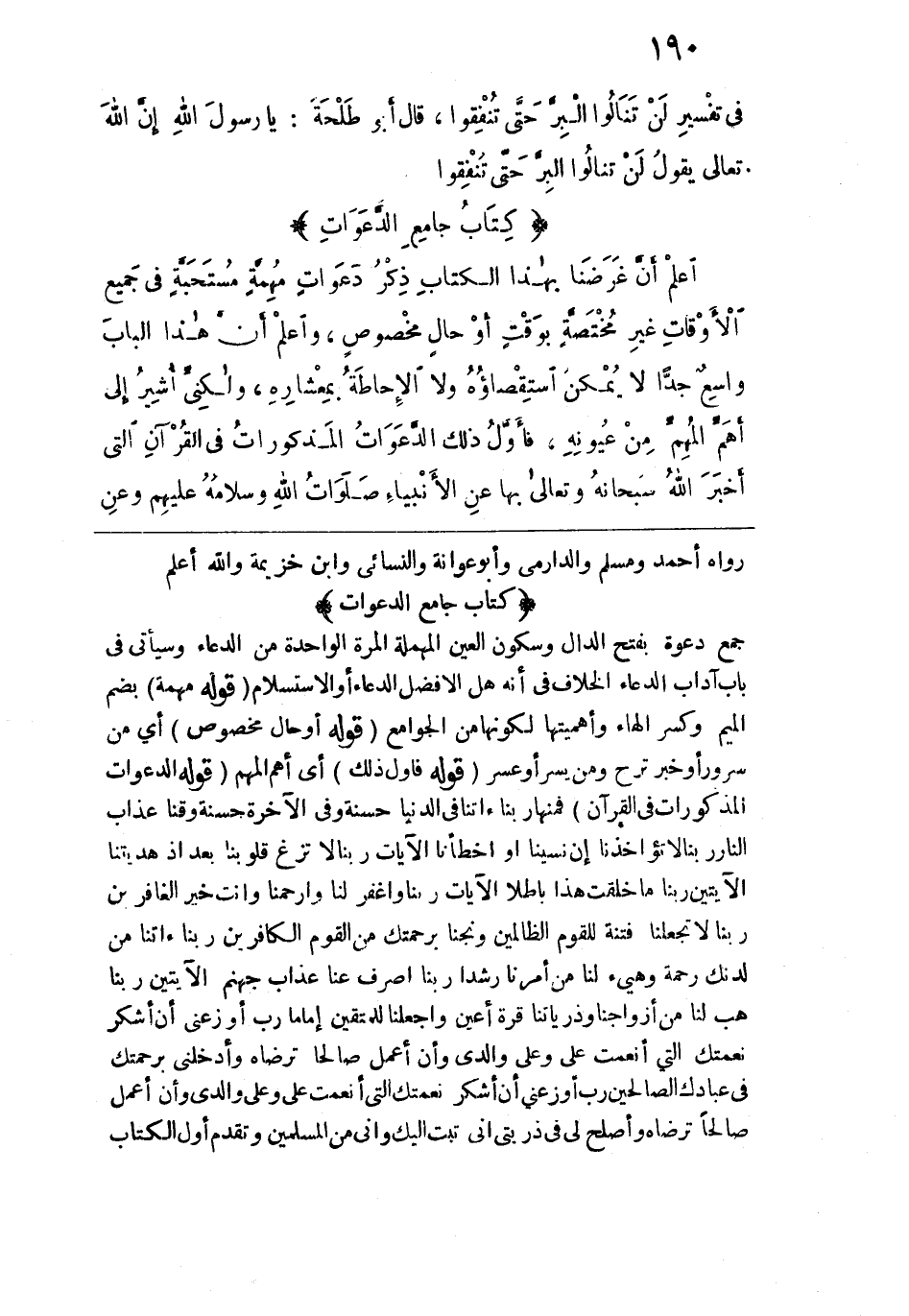 جمع دعوة بفتح الدال وسكون العين المهملة المرة الواحدة من الدعاء وسيأتي في باب آداب الدعاء الخلاف في أنه هل الأفضل الدعاء أو الاستسلام. قوله: (مهمة) بضم الميم وكسر الهاء وأهميتها لكونها من الجوامع. قوله: (أو حال مخصوص) أي من سرور أو خبر ترح ومن يسر أو عسر. قوله: (فأول ذلك) أي أهم المهم. قوله: (الدعوات المذكورات في القرآن) فمنها {رَبَّنَا آتِنَا فِي الدُّنْيَا حَسَنَةً وَفِي الْآخِرَةِ حَسَنَةً وَقِنَا عَذَابَ النَّارِ} {رَبَّنَا لَا تُؤَاخِذْنَا إِنْ نَسِينَا أَوْ أَخْطَأْنَا} الآيات {رَبَّنَا لَا تُزِغْ قُلُوبَنَا بَعْدَ إِذْ هَدَيْتَنَا} الآيتين {رَبَّنَا مَا خَلَقْتَ هَذَا بَاطِلًا} الآيات {فَاغْفِرْ لَنَا وَارْحَمْنَا وَأَنْتَ خَيْرُ الْغَافِرِينَ} {رَبَّنَا لَا تَجْعَلْنَا فِتْنَةً لِلْقَوْمِ الظَّالِمِينَ} {وَنَجِّنَا بِرَحْمَتِكَ مِنَ الْقَوْمِ الْكَافِرِينَ} {رَبَّنَا آتِنَا مِنْ لَدُنْكَ رَحْمَةً وَهَيِّئْ لَنَا مِنْ أَمْرِنَا رَشَدًا} {رَبَّنَا اصْرِفْ عَنَّا عَذَابَ جَهَنَّمَ} الآيتين {رَبَّنَا هَبْ لَنَا مِنْ أَزْوَاجِنَا وَذُرِّيَّاتِنَا قُرَّةَ أَعْيُنٍ وَاجْعَلْنَا لِلْمُتَّقِينَ إِمَامًا} {رَبِّ أَوْزِعْنِي أَنْ أَشْكُرَ نِعْمَتَكَ الَّتِي أَنْعَمْتَ عَلَيَّ وَعَلَى وَالِدَيَّ وَأَنْ أَعْمَلَ صَالِحًا تَرْضَاهُ وَأَدْخِلْنِي بِرَحْمَتِكَ فِي عِبَادِكَ الصَّالِحِينَ} {رَبِّ أَوْزِعْنِي أَنْ أَشْكُرَ نِعْمَتَكَ الَّتِي أَنْعَمْتَ عَلَيَّ وَعَلَى وَالِدَيَّ وَأَنْ أَعْمَلَ صَالِحًا تَرْضَاهُ وَأَصْلِحْ لِي فِي ذُرِّيَّتِي إِنِّي تُبْتُ إِلَيْكَ وَإِنِّي مِنَ الْمُسْلِمِينَ} وتقدم أول الكتاب
