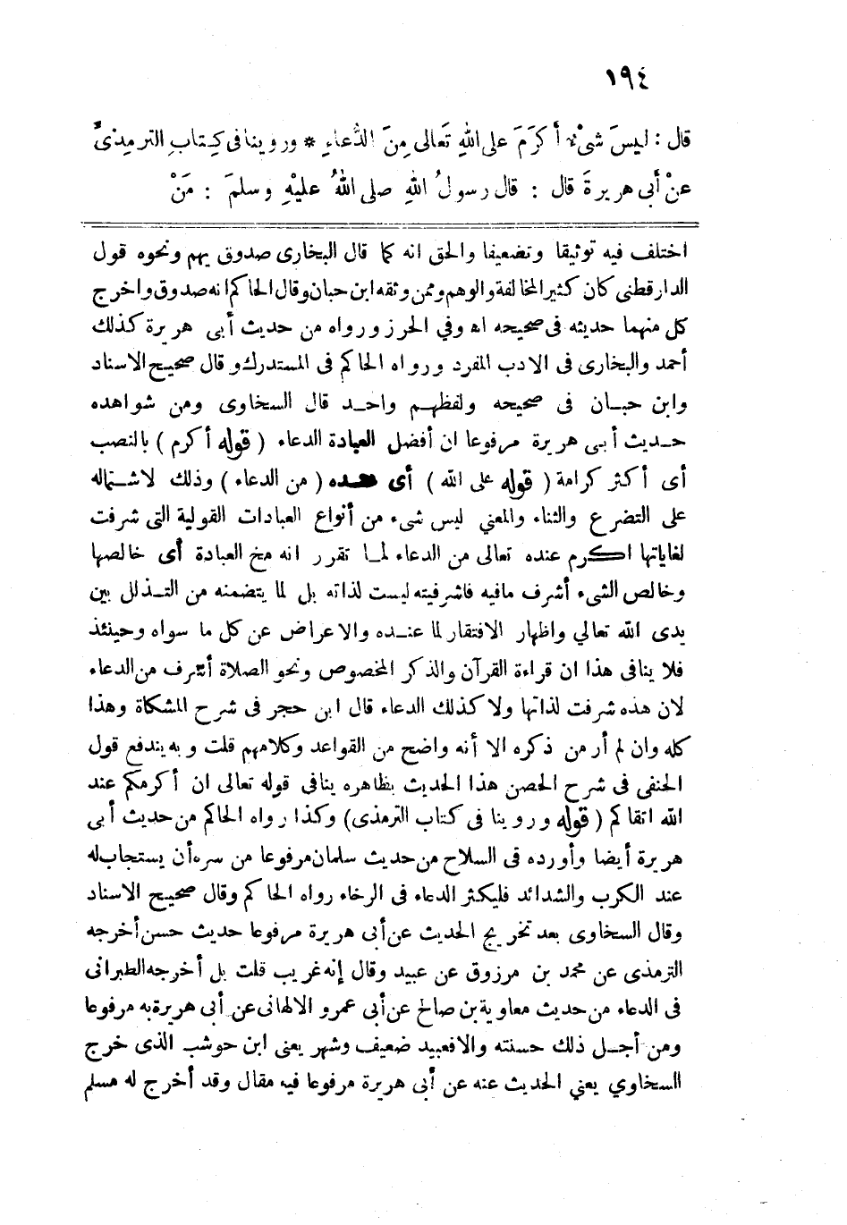 اختلف فيه توثيقاً وتضعيفاً والحق إنه كما قال البخاري صدوق يهم ونحوه قول الدارقطني كان كثير المخالفة والوهم وممن وثقه ابن حبان وقال الحاكم إنه صدوق وأخرج كل منهما حديثه في صحيحه اهـ. وفي الحرز ورواه من حديث أبي هريرة كذلك أحمد والبخاري في الأدب المفرد ورواه الحاكم في المستدرك وقال صحيح الإسناد وابن حبان في صحيحه ولفظهم واحد قال السخاوي ومن شواهده حديث أبي هريرة مرفوعاً إن أفضل العبادة الدعاء. قوله: (أكرم) بالنصب أي أكثر كرامة. قوله: (على الله) أي عنده (من الدعاء) وذلك لاشتماله على التضرع والثناء والمعنى ليس شيء من أنواع العبادات القولية التي شرفت لغاياتها أكرم عنده تعالى من الدعاء لما تقرر أنه مخ العبادة أي خالصها وخالص الشيء أشرف ما فيه فأشرفيته ليست ذاته بل لما يتضمنه من التذلل بين يدي الله تعالى وإظهار الافتقار لما عنده والإعراض عن كل ما سواه وحينئذ فلا ينافي هذا أن قراءة القرآن والذكر المخصوص ونحو الصلاة أشرف من الدعاء لأن هذه شرفت لذاتها ولا كذلك الدعاء قال ابن حجر في شرح المشكاة وهذا كله وإن لم أر من ذكره إلا أنه واضح من القواعد وكلامهم قلت وبه يندفع قول الحنفي في شرح الحصن هذا الحديث بظاهره ينافي قوله تعالى: {إِنَّ أَكْرَمَكُمْ عِنْدَ اللَّهِ أَتْقَاكُمْ}.