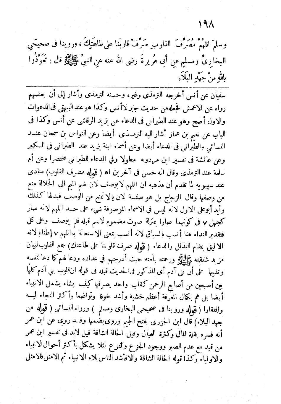 سلمة عند الترمذي وقال إنه حسن في آخرين. قوله: (مصرف القلوب) منادى عند سيبويه لما تقدم أن مذهبه أن اللهم لا يوصف لأن ضم الميم إلى الجلالة منع من وصفها وقال الزجاج بل هو صفة لأن يا لا تمنع من الوصف فبدلها كذلك وأيد أبو علي الأول لأنه ليس في الأسماء الموصوفة شيء على حد اللهم لأنه صار كجهل في كونهما صارا بمنزلة صوت مضموم لاسم قبله فلم يوصف وعلى كل فتقدير النداء هنا أنسب بالسياق لأنه أنسب بمعنى الاستعانة به اللهم إطناباً لأنه الأليق بمقام التذلل والدعاء. قوله: (صرف قلوبنا على طاعتك) جمع القلوب لبيان مزيد شفقته -صلى الله عليه وسلم- ورحمته بأمته حيث أدرجهم في عداده ودعا لهم كما دعا لنفسه وتنبيهاً على أن بني آدم أي المذكور في الحديث قبله في قوله إن قلوب بني آدم كلها بين أصبعين من أصابع الرحمن كقلب واحد يصرفها كيف يشاء يشمل الأنبياء أيضاً بل هم بكمال المعرفة أعظم خشية وأشد خوفاً وتواضعاً وأكثر التجاء إليه وافتقاراً.