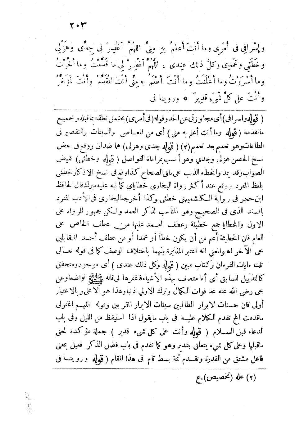 قوله: (وإسرافي) أي مجاوزتي عن الحد. وقوله: (في أمري) يحتمل تعلقه بما قبله وبجميع ما تقدمه. قوله: (وما أنت أعلم به مني) أي من المعاصي والسيئات والتقصير في الطاعات وهو تعميم بعد تعميم. قوله: (جدي وهزلي) هما ضدان ووقع في بعض نسخ الحصن هزلي وجدي وهو أنسب بمراعاة الفواصل. قوله: (وخطئي) نقيض الصواب وقد يمد والخطء الذنب على ما في الصحاح كذا وقع في نسخ الأذكار خطئي بلفظ المفرد ووقع عند أكثر رواة البخاري خطاياي كما نبه عليه ميرك قال الحافظ ابن حجر في رواية الكشميهني خطئي وكذا أخرجه البخاري في الأدب المفرد بالسند الذي في الصحيح وهو المناسب لذكر العمد ولكن جمهور الرواة على الأول والخطايا جمع خطيئة وعطف العمد عليها من عطف الخاص على العام فإن الخطيئة أعم من أن يكون خطاً أو عمداً أو من عطف أحد المتقابلين على الآخر اهـ. والمعنى أنه اعتبر المغايرة بينهما باختلاف الوصف كما في قوله تعالى: {تِلْكَ آيَاتُ الْقُرْآنِ وَكِتَابٍ مُبِينٍ} قوله: (وكل ذلك عندي) أي موجود ومتحقق كالتذييل للسابق أي أنا متصف بهذه الأشياء فاغفرها لي قاله -صلى الله عليه وسلم-: "تواضعاً" وعن علي رضي الله عد عن فوات الكمال وترك الأولى ذنباً وهذا هو الأعلى وبالاعتبار أولى فإن حسنات الأبرار الطالبين سيئات الإبرار المقربين. وقوله: (اللهم اغفر لي ما قدمت الخ) تقدم الكلام عليه في باب ما يقول إذا استيقظ من الليل وفي باب الدعاء قبل السلام. قوله: (وأنت على كل شيء قدير) جملة مؤكدة لمعنى ما قبلها وعلى كل شيء يتعلق بقدير وهو كما تقدم في باب فضل الذكر فعيل بمعنى فاعل مشتق من القدرة وتقدم ثمة بسط تام في هذا المقام.