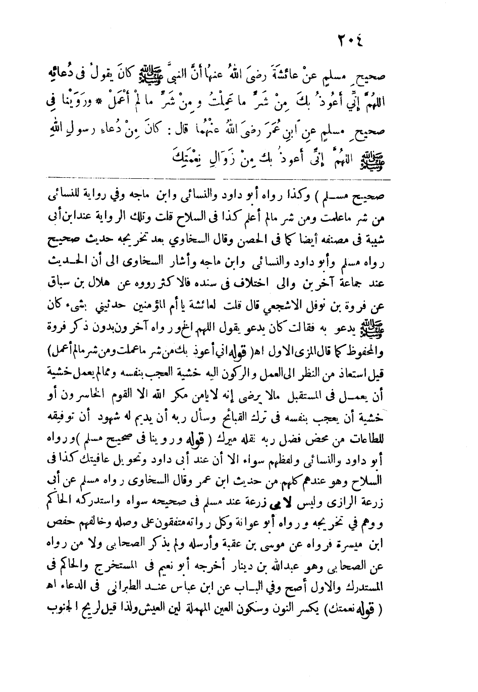 صحيح مسلم) وكذا رواه أبو داود والنسائي وابن ماجه وفي رواية للنسائي من شر ما علمت ومن شر ما لم أعلم كذا في السلاح قلت وتلك الرواية عند ابن أبي شيبة في مصنفه أيضاً كما في الحصن وقال السخاوي بعد تخريجه حديث صحيح رواه مسلم ؤأبو داود والنسائي وابن ماجه وأشار السخاوي إلى أن الحديث عند جماعة آخرين وإلى اختلاف في سنده فالأكثر رووه عن هلال بن سباق عن فروة بن نوفل الأشجعي قال قلت لعائشة: يا أم المؤمنين حدثيني بشيء كان -صلى الله عليه وسلم- يدعو به فقالت: كان يدعو يقول: "اللهم الخ" ورواه آخرون بدون ذكر فروة والمحفوظ كما قال المزي الأول اهـ. قوله: (إني أعوذ بك من شر ما عملت ومن شر ما لم أعمل) قيل استعاذ من النظر إلى العمل والركون إليه خشية العجب بنفسه ومما لم يعمل خشية أن يعمل في المستقبل ما لا يرضى
