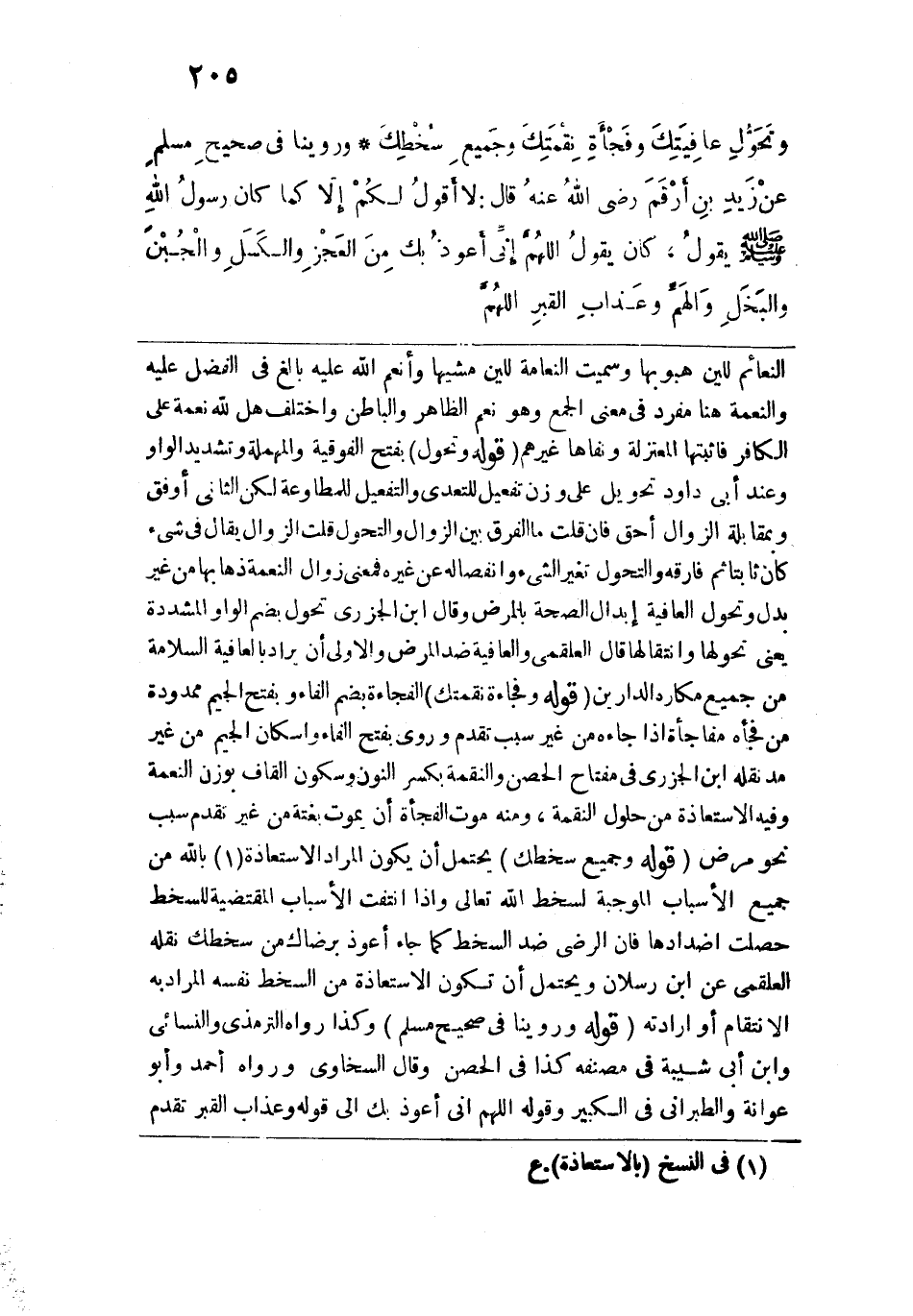 النعائم للين هبوبها وسميت النعامة للين مشيها وأنعم الله عليه بالغ في الفضل عليه والنعمة هنا مفرد في معنى الجمع وهو نعم الظاهر والباطن واختلف هل لله نعمة على الكافر فأثبتها المعتزلة ونفاها غيرهم. قوله: (وتحول) بفتح الفوقية والمهملة وتشديد الواو وعند أبي داود تحويل على وزن تفعيل للتعدي والتفعيل للمطاوعة لكن الثاني أوفق وبمقابلة الزوال أحق فإن قلت ما الفرق بين الزوال والتحول قلت الزوال يقال في شيء كان ثابتاً ثم فارقه والتحول تغير الشيء وانفصاله عن غيره فمعنى زوال النعمة ذهابها من غير بدل وتحول العافية إبدال الصحة بالمرض وقال ابن الجزري تحول بضم الواو المشددة يعني تحولها وانتقالها قال العلقمي والعافية ضد المرض والأولى أن يراد بالعافية السلامة من جميع مكاره الدارين. قوله: (وفجأة نقمتك) الفجاءة بضم الفاء وبفتح الجيم ممدودة من فجأه مفاجأة إذا جاءه من غير سبب تقدم وروي بفتح الفاء وإسكان الجيم من غير مد نقله ابن الجزري في مفتاح الحصن والنقمة بكسر النون وسكون القاف بوزن النعمة وفيه الاستعاذة من حلول النقمة، ومنه موت الفجأة أن يموت بغتة من غير تقدم سبب نحو مرض. قوله: (وجميع سخطك) يحتمل أن يكون المراد الاستعاذة بالله من جميع الأسباب الموجبة لسخط الله تعالى وإذا انتفت الأسباب المقتضية للسخط حصلت أضدادها فإن الرضى ضد السخط كما جاء أعوذ برضاك من سخطك نقله العلقمي عن ابن رسلان ويحتمل أن تكون الاستعاذة من السخط نفسه المراد به الانتقام أو إرادته.