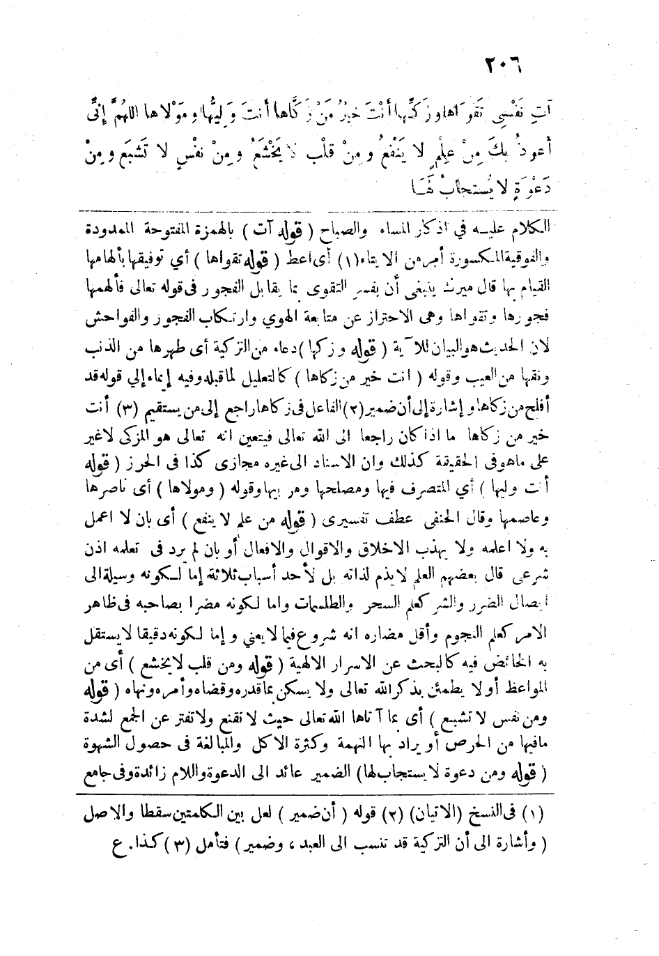 الكلام عليه في أذكار المساء والصباح. قوله: (آت) بالهمزة المفتوحة الممدودة والفوقية المكسورة أمر من الإيتاء أي أعط. قوله: (تقواها) أي توفيقها بإلهامها القيام بها وقال ميرك ينبغي أن يفسر التقوى بما يقابل الفجور في قوله تعالى: {فَأَلْهَمَهَا فُجُورَهَا وَتَقْوَاهَا} وهي الاحتراز عن متابعة الهوى وارتكاب الفجور والفواحش لأن الحديث هو البيان للآية. قوله: (وزكها) دعاء من التزكية أي طهرها من الذنب ونقها من العيب وقوله (أنت خير من زكاها) كالتعليل لما قبله وفيه إيماء إلى قوله: {قَدْ أَفْلَحَ مَنْ زَكَّاهَا} وإشارة إلى أن ضمير الفاعل في زكاها راجع إلى من يستقيم أنت خير من زكاها أما إذا كان راجعاً إلى الله تعالى فيتعين أنه تعالى هو المزكي لا غير على ما هو في الحقيقة كذلك وأن الإسناد إلى غيره مجازي كذا في الحرز. قوله: (أنت وليها) أي المتصرف فيها ومصلحها ومربيها وقوله (ومولاها) أي ناصرها وعاصمها وقال الحنفي عطف تفسيري. قوله: (من علم لا ينفع) أي بأن لا أعمل به ولا أعلمه ولا يهذب الأخلاق والأقوال والأفعال أو بأن لم يرد في تعلمه إذن شرعي قال بعضهم العلم لا يذم لذاته بل لأحد أسباب ثلاثة إما لكونه وسيلة إلى إيصال الضرر والشر كعلم السحر والطلسمات وإما لكونه مضراً بصاحبه في ظاهر الأمر كعلم النجوم وأقل مضاره أنه شروع فيما لا يعني وإما لكونه دقيقاً لا يستقل به الخائض فيه كالبحث عن الأسرار الإلهية. قوله: (ومن قلب لا يخشع) أي من المواعظ أو لا يطمئن بذكر الله تعالى ولا يسكن بما قدره وقضاه وأمره ونهاه. قوله: (ومن نفس لا تشبع) أي بما آتاها الله تعالى حيث لا تقنع ولا تفتر عن الجمع لشدة ما فيها من الحرص أو يراد بها النهمة وكثرة الأكل والمبالغة في حصول الشهوة. قوله: (ومن دعوة لا يستجاب لها) الضمير عائد إلى الدعوة واللام زائدة وفي جامع