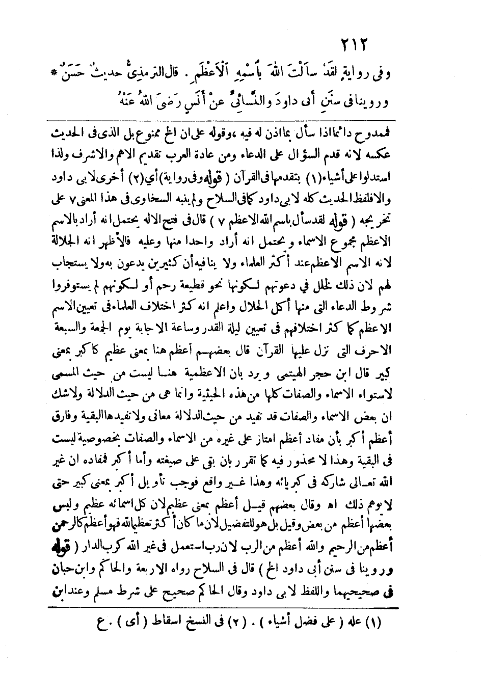 لأبي داود وإلا فلفظ الحديث كله لأبي داود كما في السلاح ولم ينبه السخاوي في هذا المعنى على تخريجه. قوله: (لقد سأل باسم الله الأعظم) قال في فتح الإله يحتمل أنه أراد بالاسم الأعظم مجموع الأسماء ويحتمل أنه أراد واحداً منها وعليه فالأظهر أنه الجلالة لأنه الاسم الأعظم عند أكثر العلماء ولا ينافيه أن كثيرين يدعون به ولا يستجاب لهم لأن ذلك لخلل في دعوتهم لكونها نحو قطيعة رحم أو لكونهم لم يستوفروا شرط الدعاء التي منها أكل الحلال واعلم أنه كثر اختلاف العلماء في تعيين الاسم الأعظم كما كثر اختلافهم في تعيين ليلة القدر وساعة الإجابة يوم الجمعة والسبعة الأحرف التي نزل عليها القرآن قال بعضهم أعظم هنا بمعنى عظيم كأكبر بمعنى كبير قال ابن حجر الهيتمي ويرد بأن الأعظمية هنا ليست من حيث المسمى لاستواء الأسماء والصفات كلها من هذه الحيثية وإنما هي من حيث الدلالة ولا شك أن بعض الأسماء والصفات قد تفيد من حيث الدلالة معاني ولا تفيدها البقية وفارق أعظم أكبر بأن مفاد أعظم امتاز على غيره من الأسماء والصفات بخصوصية ليست في البقية وهذا لا محذور فيه كما تقرر بأن بقي على صيغته وأما أكبر فمفاده أن غير الله تعالى شاركه في كبريائه وهذا غير واقع فوجب تأويل أكبر بمعنى كبير حتى لا يوهم ذلك اهـ. وقال بعضهم قيل أعظم بمعنى عظيم لأن كل أسمائه عظيم وليس بعضها أعظم من بعض وقيل بل هو للتفضيل لأن ما كان أكثر تعظيماً لله فهو أعظم كالرحمن أعظم من الرحيم والله أعظم من الرب لأن رب استعمل في غير الله كرب الدار.