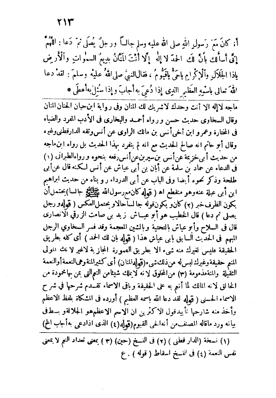 ماجه لا إله إلا أنت وحدك لا شريك لك المنان وفي رواية ابن حبان الحنان المنان وقال السخاوي حديث حسن ورواه أحمد والبخاري في الأدب المفرد والضياء في المختارة وعمرو ابن أخي أنس بن مالك الراوي عن أنس وثقه الدارقطني وغيره وقال أبو حاتم إنه صالح الحديث مع أنه لم ينفرد بهذا الحديث بل رواه ابن ماجه من حديث أبي خزيمة عن أنس بن سيرين عن أنس رفعه بنحوه ورواه الطبراني في الدعاء عن حماد بن سلمة عن أبان بن أبي عياش عن أنس لكنه قال عن أبي طلحة وذكر نحوه أيضاً وفي الباب عن أبي الدرداء رويناه من حديث إبراهيم بن أبي عبلة عنه وهو منقطع اهـ. قوله: (كان مع رسول الله -صلى الله عليه وسلم- جالساً) يحتمل أن يكون الظرف خبر كان ويكون قوله جالساً حالاً ويحتمل العكس. قوله: (ورجل يصلي ثم دعا) قال الخطيب هو أبو عياش زيد بن صامت الزرقي الأنصاري قال في السلاح وأبو عياش بالتحتية وبالشين المعجمة وقد فسر السخاوي الرجل المبهم في الحديث السابق بأبي عياش هذا. قوله: (بأن لك الحمد) أي كله بطريق الحقيقة فليس لغيرك منه شيء إلا بطريق الصورة المجازية لا غير لأنك المولى المنعم حقيقة وغيرك ليس له من ذلك شيء. قوله: (المنان) أي كثير المنة وهي النعمة أو النعمة الثقيلة والمنة مذمومة من المخلوق لأنه لا يملك شيئاً من النعم التي يمن بها محمودة من الخالق لأنه المالك لما أنعم به على الحقيقة وباقي الأسماء تقدم شرحها في