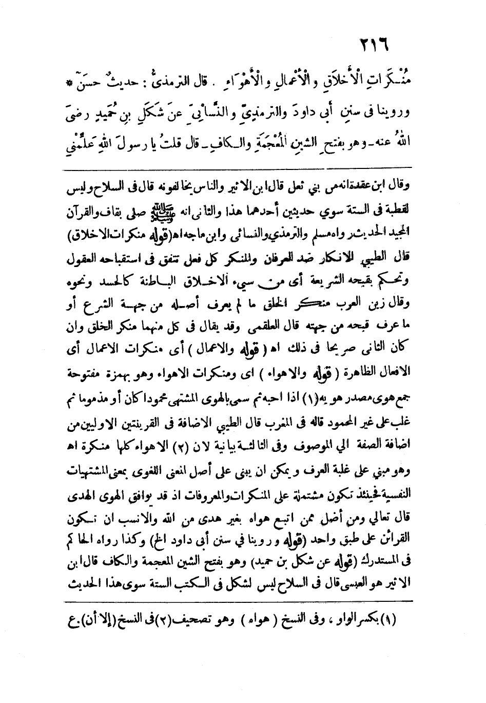 وقال ابن عقدة إنه من بني ثعل قال ابن الأثير والناس يخالفونه قال في السلاح وليس لقطبة في الستة سوى حديثين أحدهما هذا والثاني أنه -صلى الله عليه وسلم- صلى بقاف والقرآن المجيد الحديث رواه مسلم والترمذي والنسائي وابن ماجه اهـ. قوله: (منكرات الأخلاق) قال الطيبي الإنكار ضد العرفان والمنكر كل فعل تتفق في استقباحه العقول وتحكم بقبحه الشريعة أي من سيئ الأخلاق الباطنة كالحسد ونحوه وقال زين العرب منكر الخلق ما لم يعرف أصله من جهة الشرع أو ما عرف قبحه من جهته قال العلقمي وقد قال في كل منهما منكر الخلق وإن كان الثاني صريحاً في ذلك اهـ. قوله: (والأعمال) أي منكرات الأعمال أي الأفعال الظاهرة. قوله: (والأهواء) أي ومنكرات الأهواء وهو بهمزة مفتوحة جمع هوى مصدر هويه إذا أحبه ثم سمي بالهوى المشتهي محموداً كان أو مذموماً ثم غلب على غير المحمود قاله في المغرب قال الطيبي الإضافة في القرينتين الأوليين من إضافة الصفة إلى الموصوف وفي الثالثة بيانية لأن الأهواء كلها منكرة اهـ. وهو مبني على غلبة العرف ويمكن أن يبني على أصل المعنى اللغوي بمعنى المشتهيات النفسية فحينئذ تكون مشتملة على المنكرات والمعروفات إذ قد يوافق الهوى الهدى قال تعالى: {وَمَنْ أَضَلُّ مِمَّنِ اتَّبَعَ هَوَاهُ بِغَيْرِ هُدًى مِنَ اللَّهِ} والأنسب أن تكون القرائن على طبق واحد.