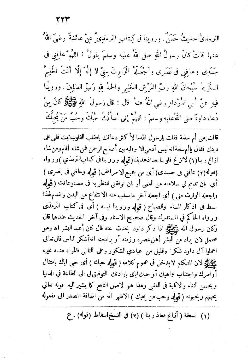 قوله: (وروينا فيه) أي في كتاب الترمذي ورواه الحاكم في المستدرك وقال صحيح الإسناد وفي آخر الحديث عندهما قال: وكان رسول الله -صلى الله عليه وسلم- إذا ذكر داود يحدث عنه قال كان أعبد البشر اهـ. وهو محتمل لأن يراد من البشر أهل عصره وزمنه أو يراد منه أنه أشكر النّاس قال تعالى: {اعْمَلُوا آلَ دَاوُودَ شُكْرًا وَقَلِيلٌ مِنْ عِبَادِيَ الشَّكُورُ} وعلى الثاني فالمراد منه غيره -صلى الله عليه وسلم- لأن المتكلم لا يدخل في عموم كلامه. قوله: (حبك) أي حبي إياك بامتثال أوامرك واجتناب نواهيك أو حبك إياي بإرادتك التوفيق