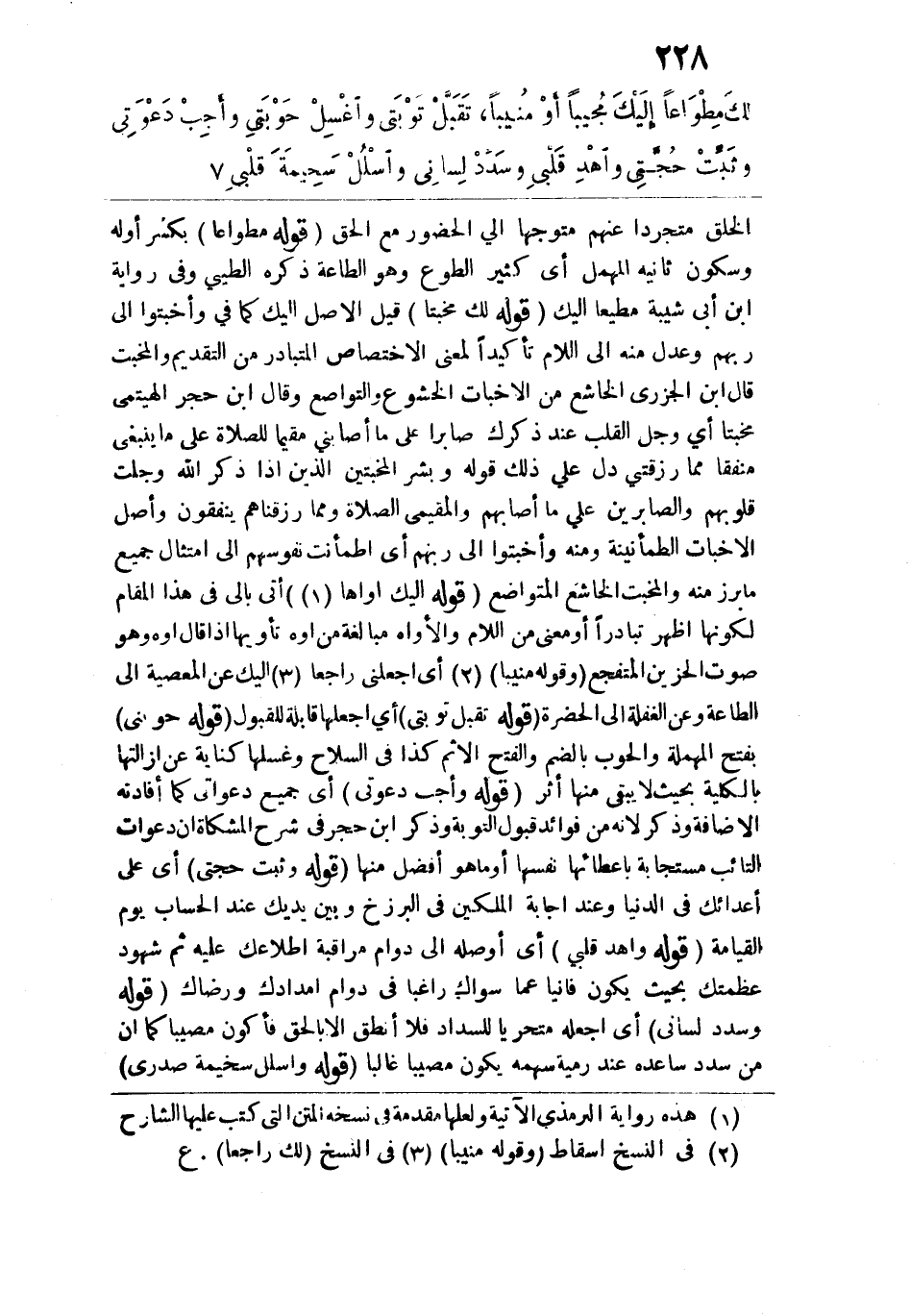 الخلق متجرداً عنهم متوجهاً إلى الحضور مع الحق. قوله: (مطواعاً) بكسر أوله وسكون ثانية المهمل أي كثير الطوع وهو الطاعة ذكره الطيبي وفي رواية ابن أبي شيبة مطيعاً إليك. قوله: (لك مخبتاً) قيل الأصل إليك كما في {وَأَخْبَتُوا إِلَى رَبِّهِمْ} وعدل منه إلى اللام تأكيداً لمعنى الاختصاص المتبادر من التقديم والمخبت قال ابن الجزري الخاشع من الإخبات الخشوع والتواضع وقال ابن حجر الهيتمي مخبتاً أي وجل القلب عند ذكرك صابراً على ما أصابني مقيماً للصلاة على ما ينبغي منفقاً مما رزقتني دل على ذلك قوله: {وَبَشِّرِ الْمُخْبِتِينَ (34) الَّذِينَ إِذَا ذُكِرَ اللَّهُ وَجِلَتْ قُلُوبُهُمْ وَالصَّابِرِينَ عَلَى مَا أَصَابَهُمْ وَالْمُقِيمِي الصَّلَاةِ وَمِمَّا رَزَقْنَاهُمْ يُنْفِقُونَ} وأصل الإخبات الطمأنينة ومنه {وَأَخْبَتُوا إِلَى رَبِّهِمْ} أي اطمأنت نفوسهم إلى امتثال جميع ما برز منه والمخبت الخاشع المتواضع. قوله: (إليك أواها) أتى بإلى في هذا المقام لكونها أظهر تبادراً أو معنى من اللام والأواه