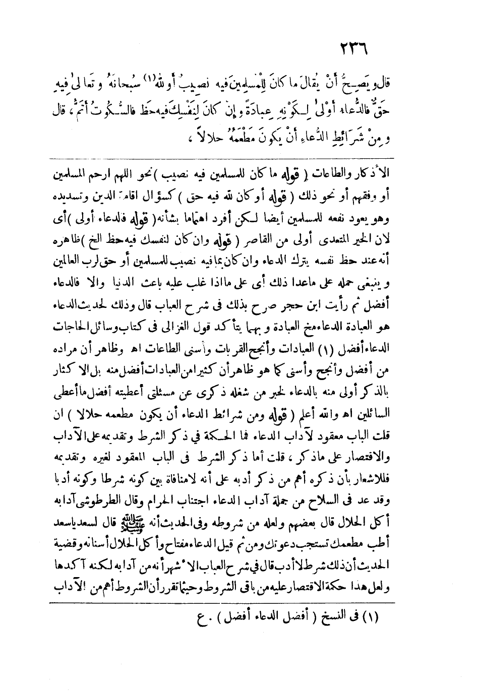 الأذكار والطاعات. قوله: (ما كان للمسلمين فيه نصيب) نحو اللهم ارحم المسلمين أو وفقهم أو نحو ذلك. قوله: (أو كان لله فيه حق) كسؤال إقامة الدين وتسديده وهو يعود نفعه للمسلمين أيضاً لكن أفرد اهتماماً بشأنه. قوله: (فالدعاء أولى) أي لأن الخير المتعدي أولى من القاصر. قوله: (وإن كان لنفسك فيه حظ الخ) ظاهره أنه عند حظ نفسه يترك الدعاء وإن كان بما فيه نصيب للمسلمين أو حق لرب العالمين وينبغي حمله على ما عدا ذلك أي على ما إذا غلب عليه باعث الدنيا وإلا فالدعاء أفضل ثم رأيت ابن حجر صرح بذلك في شرح العباب قال وذلك لحديث الدعاء هو العبادة الدعاء مخ العبادة وبهما يتأكد قول الغزالي في كتاب وسائل الحاجات الدعاء أفضل العبادات وأنجح القربات