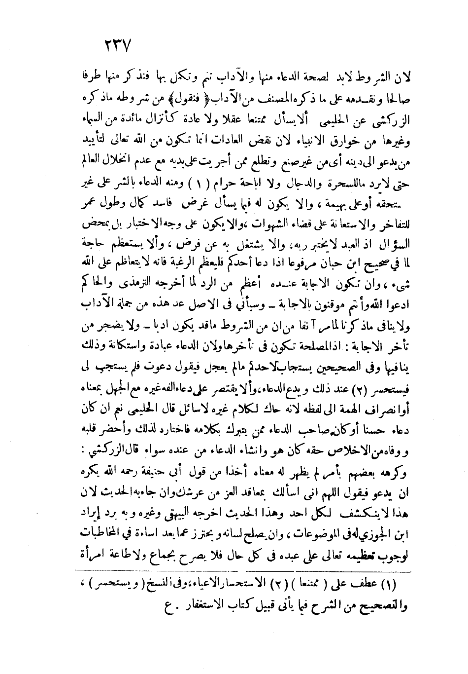 لأن الشروط لا بد لصحة الدعاء منها والآداب تتم وتكمل بها فنذكر منها طرفاً صالحاً ونقدمه على ما ذكره المصنف من الآداب (فنقول) من شروطه ما ذكره الزركشي عن الحليمي ألا يسأل ممتنعاً عقلاً ولا عادة كإنزال مائدة من السماء وغيرها من خوارق الأنبياء لأن نقض العادات إنما تكون من الله تعالى لتأييد من يدعو إلى دينه أي من غير صنع وتطلع ممن أجريت على يديه مع عدم انحلال العالم حتى لا يرد ما للسحرة والدجال ولا إباحة حرام ومنه الدعاء بالشر على غير مستحقه أو على بهيمة، وألا يكون له فيما يسأل غرض فاسد كمال وطول عمر للتفاخر والاستعانة على قضاء الشهوات، وألا يكون على وجه الاختبار بل بمحض السؤال إذ العبد لا يختبر ربه، وألا يشتغل به عن فرض، وألا يستعظم حاجة لما في صحيح ابن حبان مرفوعاً إذا دعا أحدكم فليعظم الرغبة فإنه لا يتعاظم على الله شيء، وأن تكون الإجابة عنده أعظم من الرد لما أخرجه الترمذي والحاكم ادعوا الله وأنتم موقنون بالإجابة -وسيأتي في الأصل عد هذه من جملة الآداب ولا ينافي ما ذكرنا لما من آنفاً من أن من الشرط ما قد يكون أدباً- ولا يضجر من تأخر الإجابة: إذ المصلحة تكون في تأخرها ولأن الدعاء عبادة واستكانة وذلك ينافيها وفي الصحيحين يستجاب لأحدكم ما لم يعجل فيقول دعوت فلم يستجب لي فيستحسر عند ذلك ويدع الدعاء، وألا يقتصر على دعاء ألفه غيره مع الجهل بمعناه أو انصراف الهمة إلى لفظه لأنه حاك لكلام غيره لا سائل قال الحليمي: نعم، إن كان دعاء حسناً أو كان صاحب الدعاء ممن يتبرك بكلامه فاختاره لذلك وأحضر قلبه ووفاه من الإخلاص حقه كان هو وإنشاء الدعاء من عنده سواء قال الزركشي: وكرهه بعضهم بأمر لم يظهر له معناه أخذاً من قول أبي حنيفة رحمه الله يكره أن يدعو فيقول: اللهم إني أسألك بمعاقد العز من عرشك وإن جاء به الحديث لأن هذا لا ينكشف لكل أحد وهذا الحديث أخرجه البيهقي وغيره وبه يرد إيراد ابن الجوزي له في الموضوعات، وأن يصلح لسانه ويحترز عما يعد إساءة في المخاطبات لوجوب تعظيمه تعالى على عبده في كل حال فلا يصرح بجماع ولا طاعة امرأة