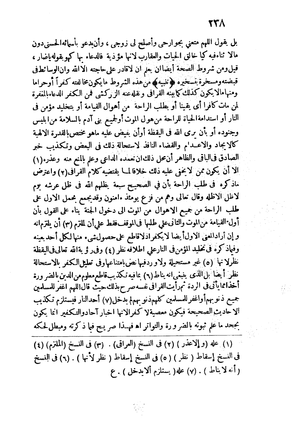 من هذه الشروط ما يكون مخالفته كفراً أو حراماً ومنها ما لا يكون كذلك كما بينه القرافي ونقله عنه الزركشي فمن الكفر الدعاء بالمغفرة لمن مات كافراً أي يقيناً أو بطلب الراحة من أهوال القيامة أو بتخليد مؤمن في النار أو استدامة الحياة للراحة من هول الموت أو لجميع بني آدم بالسلامة من إبليس وجنوده أو بأن يرى الله في اليقظة أو أن يفيض عليه ما هو مختص بالقدرة الإلهية كالإيجاد والإعدام والقضاء النافذ لاستحالة ذلك في البعض وتكذيب خبر الصادق في الباقي والظاهر أن محل ذلك إن تعمده الداعي وعلم بالمنع منه وعذره إلا أن يكون ممن لا يخفى عليه ذلك خلافاً لما يقتضيه كلام القرافي واعترض ما ذكره في طلب الراحة بأن في الصحيح سبعة يظلهم الله في ظل عرشه يوم لا ظل إلا ظله وقال تعالى: {وَهُمْ مِنْ فَزَعٍ يَوْمَئِذٍ آمِنُونَ} وقد يجمع بحمل الأول على طلب الراحة من جميع الأهوال من الموت إلى دخول الجنة بناء على القول بأن أول القيامة من الموت والثاني على طلبها في الموقف فقط على أن لملتزم أن يلتزم أنه وإن أراد المعنى الأول أيضاً لا يكفر إذ لا قاطع على حصول شيء منها لكل أحد بعينه وفيما ذكره في تخليد المؤمن في النار على إطلاقه نظر وفي رؤية الله تعالى في اليقظة نظر لأنها غير مستحيلة ولا ورد فيها نص بامتناعها وفي تعليل الكفر بالاستحالة نظر أيضاً بل الذي ينبغي أنه يناط بما فيه تكذيب قاطع معلوم من الدين بالضرورة أخذاً مما يأتي في الردة ثم رأيت القرافي نفسه صرح بذلك حيث قال اللهم اغفر للمسلمين جميع ذنوبهم أو اغفر للمسلمين كلهم ذنوبهم لم يدخل أحد النار فيستلزم تكذيب الأحاديث الصحيحة فيكون معصية لا كفراً لأنها إخبار آحاد والتكفير إنما يكون بجحد ما علم ثبوته بالضرورة والتواتر اهـ فهذا صريح فيما ذكرته ومبطل لحكمه