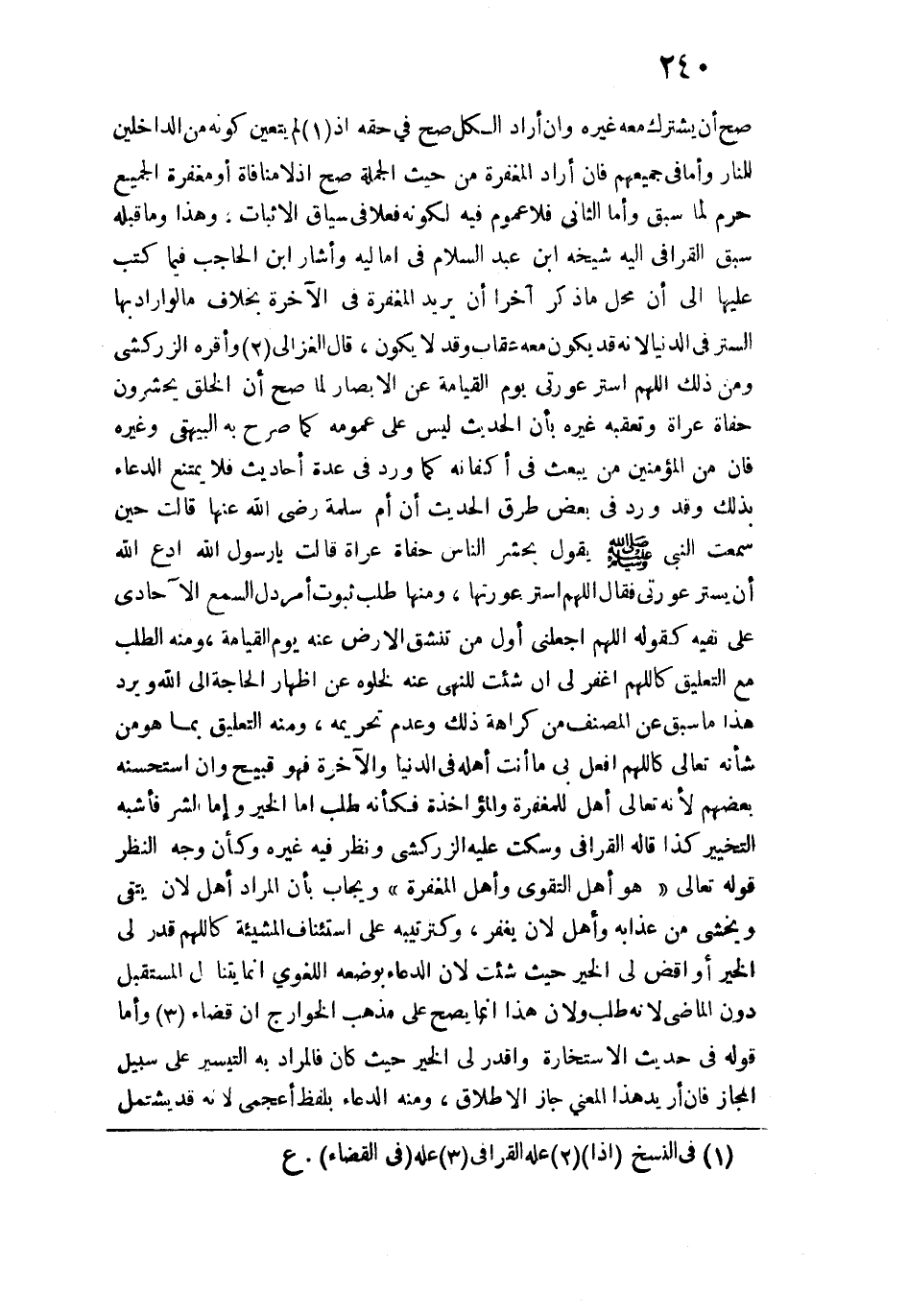 صح أن يشترك معه غيره وإن أراد الكل صح في حقه إذ لم يتعين كونه من الداخلين للنار وأما في جميعهم فإن أراد المغفرة من حيث الجملة صح إذ لا منافاة أو مغفرة الجميع حرم لما سبق وأما الثاني فلا عموم فيه لكونه فعلاً في سياق الإثبات. وهذا وما قبله سبق القرافي إليه شيخه ابن عبد السلام في أماليه وأشار ابن الحاجب فيما كتب عليها إلى أن محل ما ذكر آخراً أن يريد المغفرة في الآخرة بخلاف ما لو أراد بها الستر في الدنيا لأنه قد يكون معه عقاب وقد لا يكون، قال الغزالي وأقره الزركشي ومن ذلك اللهم استر عورتي يوم القيامة عن الأبصار لما صح أن الخلق يحشرون حفاة عراة وتعقبه غيره بأن الحديث ليس على عمومه كما صرح به البيهقي وغيره فإن من المؤمنين من يبعث في أكفانه كما ورد في عدة أحاديث فلا يمتنع الدعاء بذلك وقد ورد في بعض طرق الحديث أن أم سلمة رضي الله عنها قالت حين سمعت النبي -صلى الله عليه وسلم- يقول: "يحشر النّاس حفاة عراة" قالت: يا رسول الله: ادع الله أن يستر عورتي، فقال: اللهم استر عورتها، ومنها طلب ثبوت أمر دل السمع الآحادي على نفيه كقوله: اللهم اجعلني أول من تنشق الأرض عنه يوم القيامة، ومنه الطلب مع التعليق كاللهم اغفر لي إن شئت للنهي عنه لخلوه عن إظهار الحاجة إلى الله ويرد هذا ما سبق عن المصنف من كراهة ذلك وعدم تحريمه، ومنه التعليق بما هو من شأنه تعالى كاللهم افعل بي ما أنت أهله في الدنيا والآخرة فهو قبيح وإن استحسنه بعضهم لأنه تعالى أهل للمغفرة والمؤاخذة فكأنه طلب إما الخير وإما الشر فأشبه التخيير كذا قاله القرافي وسكت عليه الزركشي ونظر فيه غيره وكأن وجه النظر قوله تعالى: {هُوَ أَهْلُ التَّقْوَى وَأَهْلُ الْمَغْفِرَةِ} ويجاب بأن المراد أهل لأن يتقى ويخشى من عذابه وأهل لأن يغفر، وكترتيبه على استئناف المشيئة كاللهم قدر لي الخير أو اقض لي الخير حيث شئت لأن الدعاء بوضعه اللغوي إنما يتناول المستقبل دون الماضي لأنه طلب ولأن هذا إنما صح على مذهب الخوارج أن قضاء وأما قوله في حديث الاستخارة واقدر لي الخير حيث كان فالمراد به التيسير على سبيل المجاز فإن أريد هذا المعنى جاز الإطلاق، ومنه الدعاء بلفظ أعجمي لأنه قد يشتمل