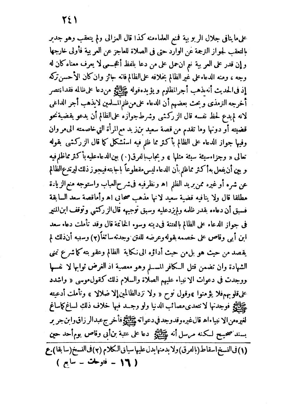 لأنه لم يدع لحظ نفسه قال الزركشي وشروط جوازه على الظالم أن يدعو بقضية نحو قضيته أو دونها وما تقدم من قصة سعيد بن زيد مع المرأة التي خاصمته إلى مروان وفيها جواز الدعاء على الظالم بأكثر مما ظلم فيه استشكل كما قال الزركشي بقوله تعالى: {وَجَزَاءُ سَيِّئَةٍ سَيِّئَةٌ مِثْلُهَا} ويجاب بالفرق بين الدعاء عليه بأكثر مما ظلم فيه وبين أن يفعل به أكثر مما ظلم بأن الدعاء ليس مقطوعاً بإجابته فيجوز ذلك ليرتدع الظالم عن شره أو غيره ممن يريد الظلم اهـ. ونظر فيه في شرح العباب واستوجه منع الزيادة مطلقاً قال ولا ينافيه قضية سعيد لأنها مذهب صحابي اهـ وأما قصة سعد السابقة فسبق أن دعاءه بقدر ظلمه ولم يزد عليه وسبق توجيهه قال الزركشي وتوقف ابن المنير في جواز الدعاء على الظالم بالفتنة في دينه وسوء الخاتمة قال وقد تأملت دعاء سعد بن أبي وقاص على خصمه بقوله وعرضه للفتن وجدته سائغاً وسببه أن ذلك لم يقصد من حيث هو بل من حيث أدائه إلى نكاية الظالم وعقوبته كما شرع تمني الشهادة وإن تضمن قتل الكافر المسلم وهو معصية إذ الغرض ثوابها لا نفسها ووجدت في دعوات الأنبياء عليهم الصلاة والسلام ذلك كقول موسى: "واشدد على قلوبهم فلا يؤمنوا"، وقول نوح: {وَلَا تَزِدِ الظَّالِمِينَ إِلَّا ضَلَالًا} وتأملت أدعيته -صلى الله عليه وسلم- فوجدتها لا تتعدى مصائب الدنيا ولو وجد فيها خلاف ذلك لساغ كما ساغ لغيره من الأنبياء اهـ قال غيره وفي وجد في دعواته -صلى الله عليه وسلم- فأخرج عبد الرزاق وابن جرير بسند صحيح لكنه مرسل أنه -صلى الله عليه وسلم- دعا على عتبة بن أبي وقاص يوم أحد حين