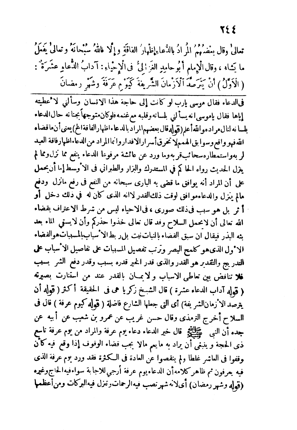 النفع في رفع ما نزل ودفع ما لم ينزل والدعاء موافق لوقت ذلك القدر لا أنه الذي كان له في ذلك دخل أو أثر بل هو سبب في ذلك صوري، في الأحياء ليس من شرط الاعتراف بقضاء الله تعالى أن لا يحمل السلاح وقد قال تعالى: {وَخُذُوا حِذْرَكُمْ} وأن لا يسقي الماء بعد بثه البذر فيقال: إن سبق القضاء بالنبات نبت بل ربط الأسباب بالمسببات هو القضاء الأول الذي هو كلمح البصر وترتب تفصيل المسببات على تفاصيل الأسباب على التدريج والتقدير هو القدر والذي قدر الخير قدره بسبب وقدر دفع الشر بسبب فلا تناقض بين تعاطي الأسباب والإيمان بالقدر عند من استنارت بصيرته. قوله: (آداب الدعاء عشرة) قال الشيخ زكريا هي في الحقيقة أكثر. قوله: (أن يترصد الأزمان الشريفة) أي التي جعلها الشارع فاضلة. قوله: (كيوم عرفة) قال في السلاح أخرج الترمذي وقال حسن غريب عن عمرو بن شعيب عن أبيه عن جده أن النبي -صلى الله عليه وسلم- قال: "خير الدعاء دعاء يوم عرفة" والمراد من يوم عرفة تاسع ذي الحجة وينبغي أن يراد به ما يعم ما لا يجب قضاء الوقوف إذا وقع فيه كأن وقفوا في العاشر غلطاً ولم ينقصوا عن العادة في الكثرة فقد ورد يوم عرفة الذي فيه يعرفون ثم ظاهر كلامه أن الدعاء يوم عرفة أرجى للإجابة سواء فيه الحاج وغيره. قوله: (وشهر رمضان) أي لأنه شهر تصب فيه الرحمات وتنزل فيه البركات ومن أعظمها