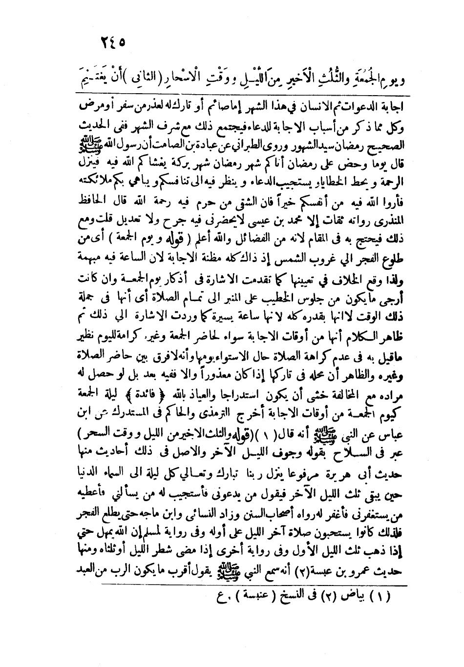 ليلة الجمعة كيوم الجمعة من أوقات الإجابة أخرج الترمذي والحاكم في المستدرك عن ابن عباس عن النبي -صلى الله عليه وسلم- أنه قال: قوله: (والثلث الأخير من الليل ووقت السحر) عبر في السلاح بقوله: