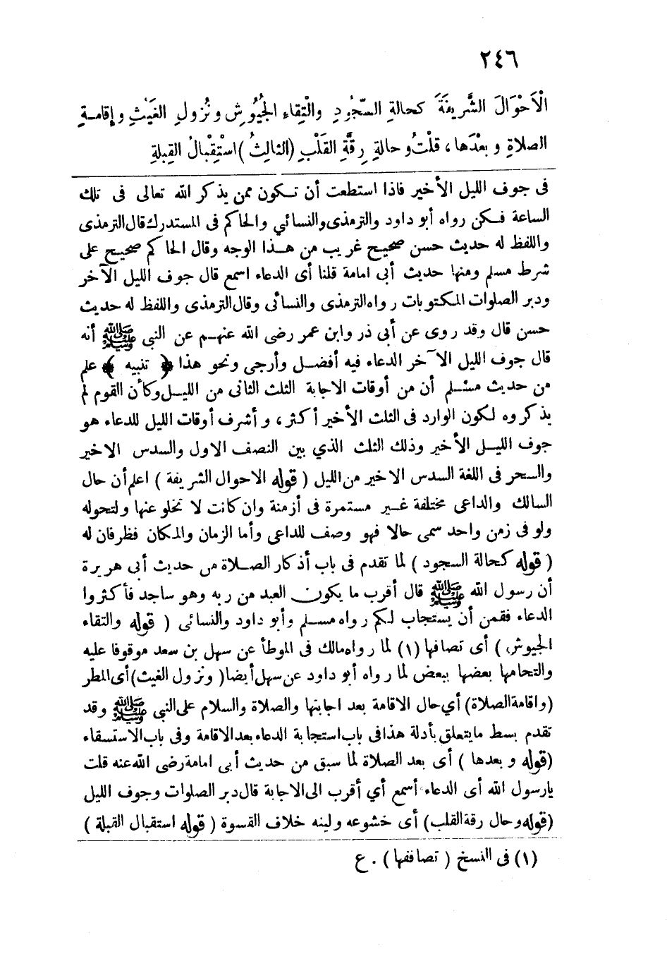 علم من حديث مسلم أن من أوقات الإجابة الثلث الثاني من الليل وكأن القوم لم يذكروه لكون الوارد في الثلث الأخير أكثر، وأشرف أوقات الليل للدعاء هو جوف الليل الأخير وذلك الثلث الذي بين النصف الأول والسدس الأخير والسحر في اللغة السدس الأخير من الليل. قوله: (الأحوال الشريفة) اعلم أن حال السالك والداعي مختلفة غير مستمرة في أزمنة وإن كانت لا تخلو عنها ولتحوله ولو في زمن واحد سمي حالاً فهو وصف للداعي وأما الزمان والمكان فظرفان له. قوله: (كحالة السجود) لما تقدم في باب أذكار الصلاة من حديث أبي هريرة أن رسول الله -صلى الله عليه وسلم- قال: أقرب ما يكون العبد من ربه وهو ساجد فأكثروا الدعاء فقمن أن يستجاب لكم رواه مسلم وأبو داود والنسائي. قوله: (والتقاء الجيوش) أي تصافها لما رواه مالك في الموطأ عن سهل بن سعد موقوفاً عليه والتحامها بعضها ببعض لما رواه أبو داود عن سهل أيضاً (ونزول الغيث) أي المطر (وإقامة الصلاة) أي حال الإقامة بعد إجابتها والصلاة والسلام على النبي -صلى الله عليه وسلم- وقد تقدم بسط ما يتعلق بأدلة هذا في باب استجابة الدعاء بعد الإقامة وفي باب الاستسقاء. قوله: (وبعدها) أي بعد الصلاة لما سبق من حديث أبي أمامة رضي الله عنه قلت: يا رسول الله أي الدعاء أسمع أي أقرب إلى الإجابة قال: دبر الصلوات وجوف الليل. قوله: (وحال رقة القلب) أي خشوعه ولينه خلاف القسوة. قوله: (استقبال القبلة)