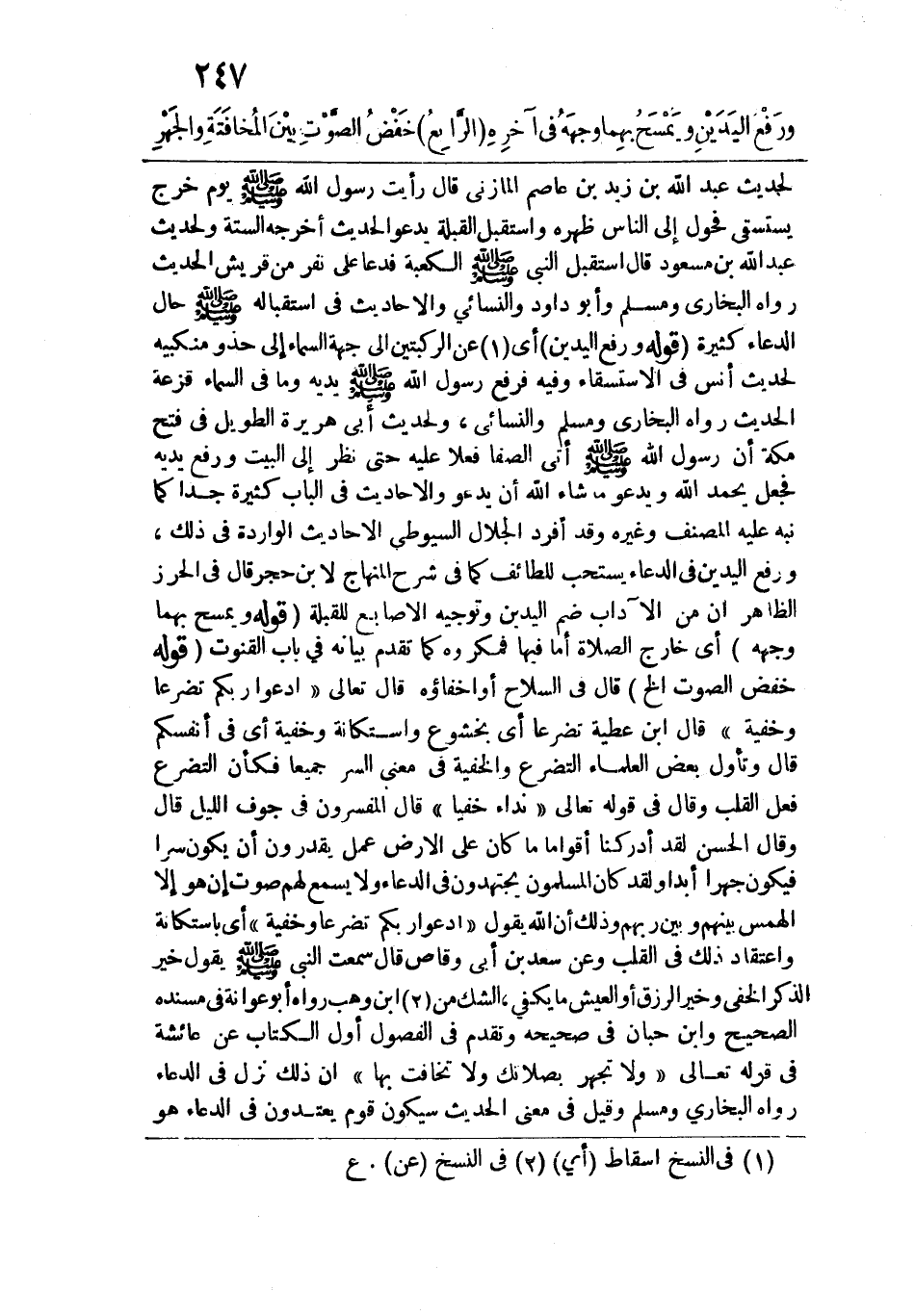 والنسائي والأحاديث في استقباله -صلى الله عليه وسلم- حال الدعاء كثيرة. قوله: (ورفع اليدين) أي عن الركبتين إلى جهة السماء إلى حذو منكبيه لحديث أنس في الاستسقاء وفيه فرفع رسول الله -صلى الله عليه وسلم- يديه وما في السماء قزعة الحديث رواه البخاري ومسلم والنسائي، ولحديث أبي هريرة الطويل في فتح مكة أن رسول الله -صلى الله عليه وسلم- أتى الصفا فعلا عليه حتى نظر إلى البيت ورفع يديه فجعل يحمد الله ويدعو ما شاء الله أن يدعو والأحاديث في الباب كثيرة جداً كما نبه عليه المصنف وغيره وقد أفرد الجلال السيوطي الأحاديث الواردة في ذلك، ورفع اليدين في الدعاء يستحب للطائف كما في شرح المنهاج لابن حجر قال في الحرز الظاهر إن من الآداب ضم اليدين وتوجيه الأصابع للقبلة. قوله: (ويمسح بهما وجهه) أي خارج الصلاة أما فيها فمكروه كما تقدم بيانه في باب القنوت. قوله: (خفض الصوت الخ) قال في السلاح أو إخفاؤه قال تعالى: {ادْعُوا رَبَّكُمْ تَضَرُّعًا وَخُفْيَةً} قال ابن عطية تضرعاً أي بخشوع واستكانة وخفية أي في أنفسكم قال وتأول بعض العلماء التضرع والخفية في معنى السر جميعاً فكأن التضرع فعل القلب وقال في قوله تعالى: {نِدَاءً خَفِيًّا} قال المفسرون في جوف الليل قال وقال الحسن لقد أدركنا أقواماً ما كان على الأرض عمل يقدرون أن يكون سراً فيكون جهراً أبداً ولقد كان المسلمون يجتهدون في الدعاء ولا يسمع لهم صوت إن هو إلا الهمس بينهم وبين ربهم وذلك أن الله يقول: {دْعُوا رَبَّكُمْ تَضَرُّعًا وَخُفْيَةً} أي باستكانة واعتقاد ذلك في القلب وعن سعد بن أبي وقاص قال: سمعت النبي -صلى الله عليه وسلم- يقول: "خير الذكر الخفي وخير الرزق أو العيش ما يكفي "الشك من ابن وهب رواه أبو عوانة في مسنده الصحيح وابن حبان في صحيحه وتقدم في الفصول أول الكتاب عن عائشة في قوله تعالى: {وَلَا تَجْهَرْ بِصَلَاتِكَ وَلَا تُخَافِتْ بِهَا} إن ذلك نزل في الدعاء رواه البخاري ومسلم وقيل في معنى الحديث سيكون قوم يعتدون في الدعاء هو