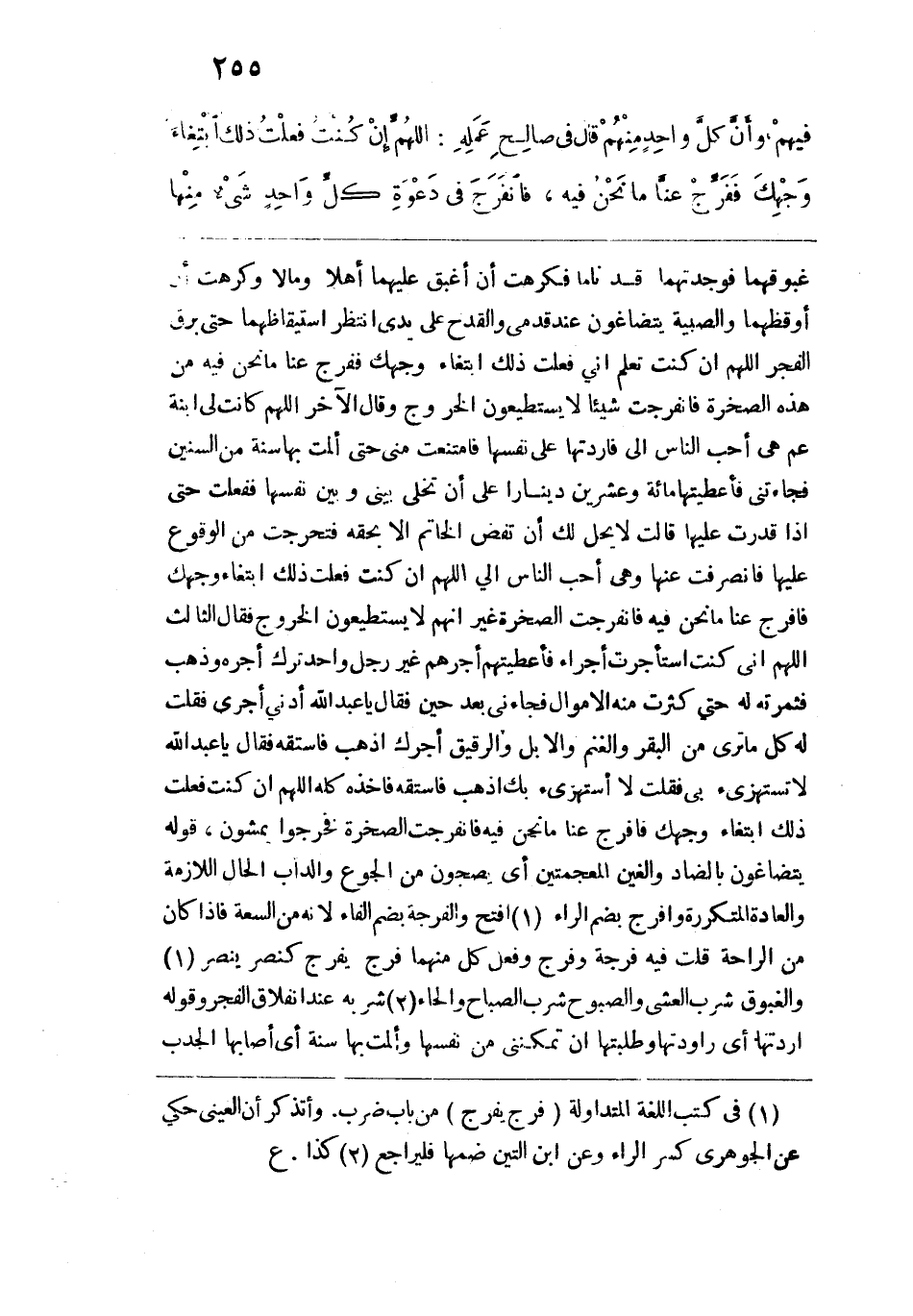 غبوقهما فوجدتهما قد ناما فكرهت أن أغبق عليهما أهلاً ومالاً وكرهت أن أوقظهما والصبية يتضاغون عند قدمي والقدح على يدي انتظر استيقاظهما حتى برق الفجر: اللهم إن كنت تعلم أني فعلت ذلك ابتغاء وجهك ففرج عنا ما نحن فيه من هذه الصخرة فانفرجت شيئاً لا يستطيعون الخروج، وقال الآخر: اللهم كانت لي ابنة عم هي أحب النّاس إلي فأردتها على نفسها فامتنعت مني حتى ألمت بها سنة من السنين فجاءتني فأعطيتها مائة وعشرين ديناراً على أن تخلي بيني وبين نفسها ففعلت حتى إذا قدرت عليها قالت لا يحل لك أن تفض الخاتم إلا بحقه فتحرجت من الوقوع عليها فانصرفت عنها وهي أحب النّاس إلي اللهم إن كنت فعلت ذلك ابتغاء وجهك فافرج عنا ما نجن فيه فانفرجت الصخرة غير أنهم لا يستطيعون الخروج، فقال الثالث: اللهم إني كنت استأجرت أجراء فأعطيتهم أجرهم غير رجل واحد ترك أجره وذهب فثمرته له حتى كثرت منه الأموال فجاءني بعد حين فقال: يا عبد الله أدني أجري فقلت له: كل ما ترى من البقر والغنم والإبل والرقيق أجرك اذهب فاستقه، فقال: يا عبد الله لا تستهزيء بي، فقلت: لا أستهزيء بك اذهب فاستقه، فأخذه كله اللهم إن كنت فعلت ذلك ابتغاء وجهك فافرج عنا ما نحن فيه فانفرجت الصخرة فخرجوا يمشون، قوله يتضاغون بالضاد والغين المعجمتين أي يضجون من الجوع والداب الحال اللازمة والعادة المتكررة وافرج بضم الراء افتح والفرجة بضم الفاء لأنه من السبعة فإذا كان من الراحة قلت فيه فرجة وفرج وفعل كل منهما فرج يفرج كنصر ينصر والغبوق شرب العشي والصبوح شرب الصباح والحاء شربه عند انفلاق الفجر وقوله: أردتها أي راودتها وطلبتها أن تمكنني من نفسها وألمت بها سنة أي أصابها الجدب