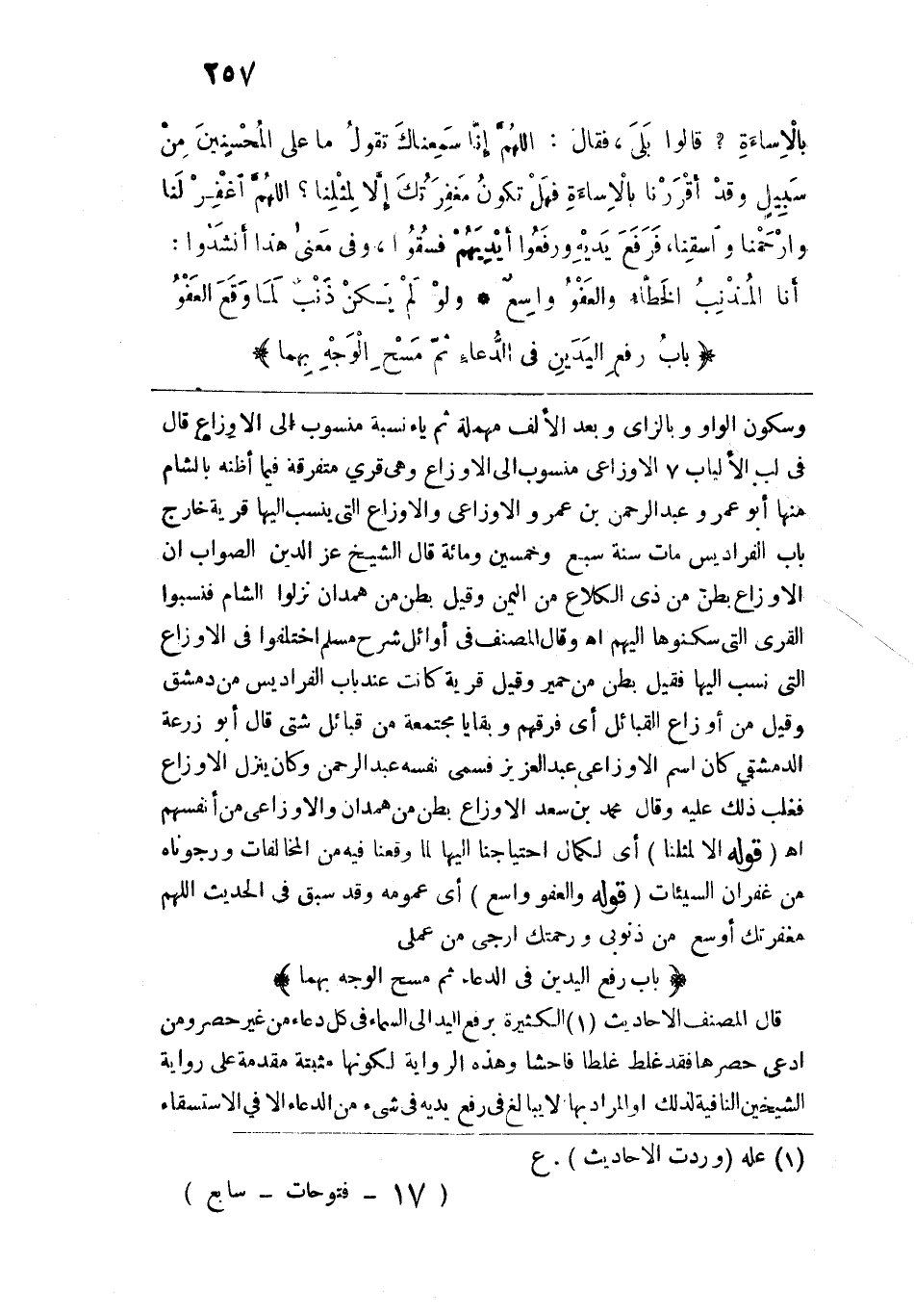 وسكون الواو وبالزاي وبعد الألف مهملة ثم ياء نسبة منسوب إلى الأوزاع قال في لب الألباب الأوزاعي منسوب إلى الأوزاع وهي قرى متفرقة فيما أظنه بالشام منها أبو عمر وعبد الرحمن بن عمر والأوزاعي والأوزاع التي ينسب إليها قرية خارج باب الفراديس مات سنة سبع وخمسين ومائة قال الشيخ عز الدين الصواب إن الأوزاع بطن من ذي الكلاع من اليمن وقيل بطن من همدان نزلوا الشام فنسبوا القرى التي سكنوها إليهم اهـ. وقال المصنف في أوائل شرح مسلم اختلفوا في الأوزاع التي نسب إليها فقيل بطن من حمير وقيل قرية كانت عند باب الفراديس من دمشق وقيل من أوزاع القبائل أي فرقهم وبقايا مجتمعة من قبائل شتى قال أبو زرعة الدمشقي: كان اسم الأوزاعي عبد العزيز فسمى نفسه عبد الرحمن وكان ينزل الأوزاع فغلب ذلك عليه وقال محمد بن سعد الأوزاع بطن من همدان والأوزاعي من أنفسهم اهـ. قوله: (إلا لمثلنا) أي لكمال احتياجنا إليها لما وقعنا فيه من المخالفات ورجوناه من غفران السيئات. قوله: (والعفو واسع) أي عمومه وقد سبق في الحديث اللهم مغفرتك أوسع من ذنوبي ورحمتك أرجى من عملي.