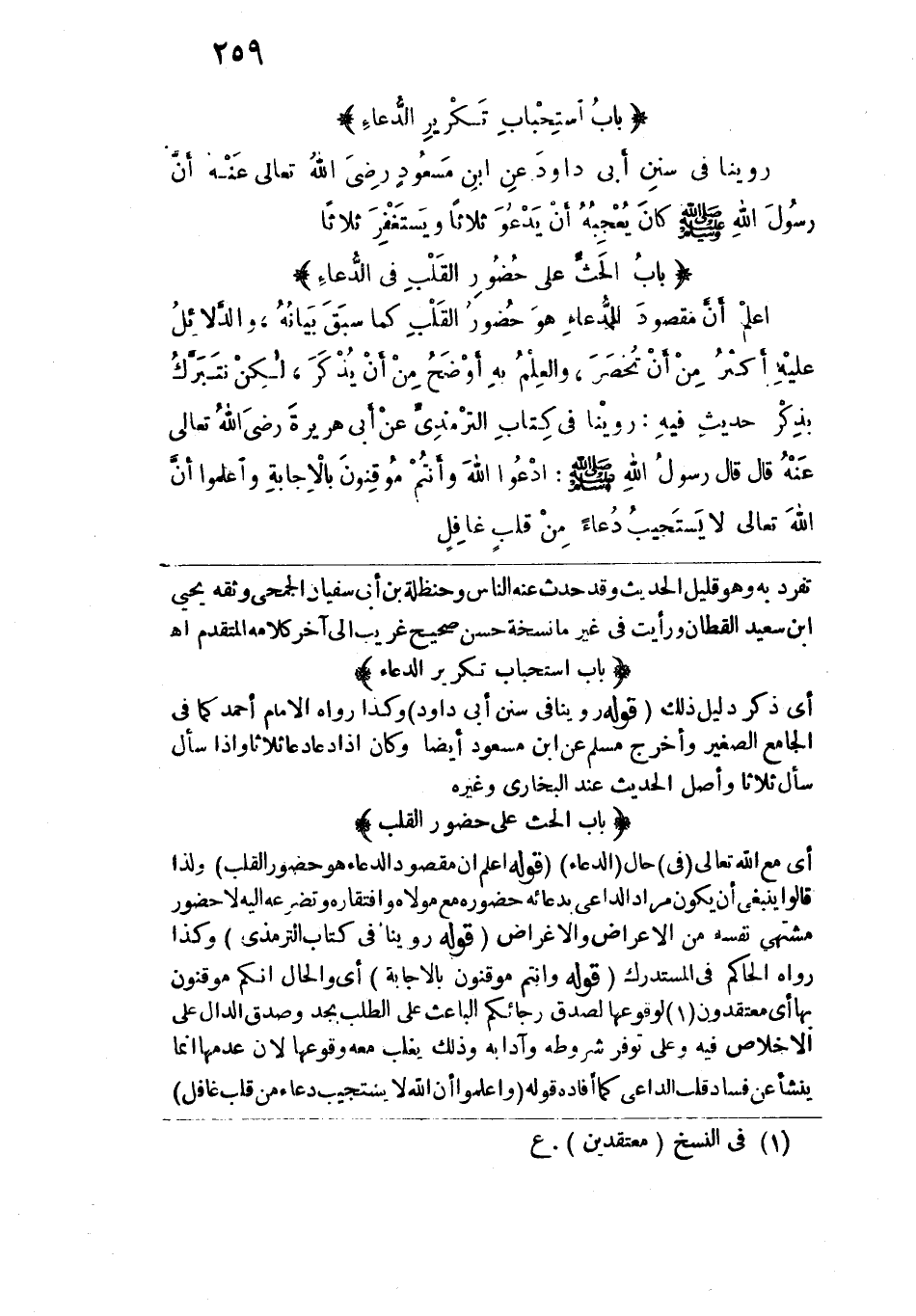 أي ذكر دليل ذلك. قوله: (وينافي سنن أبي داود) وكذا رواه الإِمام أحمد كما في الجامع الصغير وأخرج مسلم عن ابن مسعود أيضاً وكان إذا دعا دعا ثلاثاً وإذا سأل سأل ثلاثاً وأصل الحديث عند البخاري وغيره.