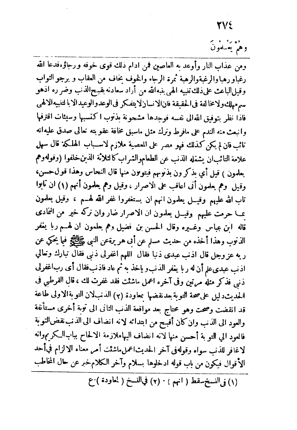ومن عذاب النار وأوعد به العاصين فمن أدام ذلك قوي خوفه ورجاؤه فدعا الله رغباً ورهباً والرغبة والرهبة ثمرة الرجاء والخوف يخاف من العقاب ويرجو الثواب وقيل الباعث على ذلك تنبيه إلهي ينبه الله من أراد سعادته بقبح الذنب وضرره إذ هو سم مهلك ولا مخالفة في الحقيقة فإن الإنسان لا يتفكر في الوعد والوعيد إلا بالتنبيه الإلهي فإذا نظر بتوفيق الله إلى نفسه فوجدها مشحونة بذنوب اكتسبها وسيئات اقترفها وانبعث منه الندم على ما فرط وترك مثل ما سبق مخافة عقوبته تعالى صدق عليه أنه تائب فإن لم يكن كذلك فهو مصر على المعصية ملازم لأسباب الهلكة قال سهل: علامة التائب أن يشغله الذنب عن الطعام والشراب كالثلاثة الذين خلفوا وقوله: {وَهُمْ يَعْلَمُونَ} قيل: أي يذكرون بذنوبهم فيتوبون منها قال النحاس وهذا قول حسن، وقيل: وهم يعلمون أني أعاقب على الإصرار، وقيل: وهم يعلمون أنهم إن تابوا تاب الله عليهم وقيل يعلمون أنهم إن يستغفروا غفر الله لهم، وقيل: يعلمون بما