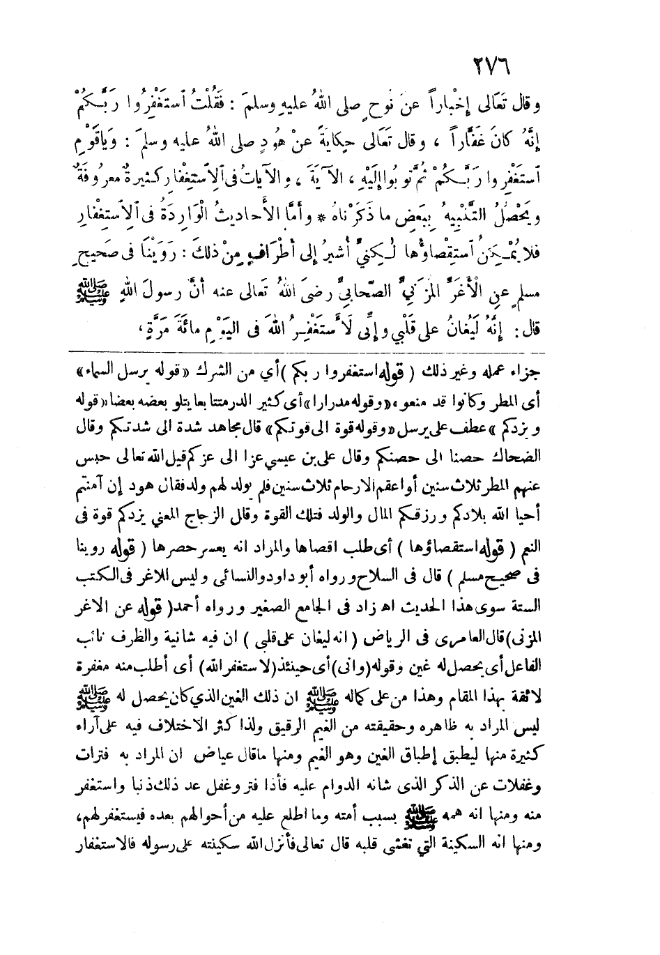 وقال تعالى إخباراً عن نوح -صلى الله عليه وسلم-: {فَقُلْتُ اسْتَغْفِرُوا رَبَّكُمْ إِنَّهُ كَانَ غَفَّارًا} [نوح: 10] وقال تعالى حكاية عن هود -صلى الله عليه وسلم-: {وَيَا قَوْمِ اسْتَغْفِرُوا رَبَّكُمْ ثُمَّ تُوبُوا إِلَيْهِ ... } [هود: 52] والآيات في الاستغفار كثيرة معروفة، ويحصل التنبيه ببعض ما ذكرناه.
