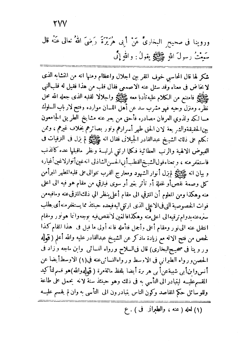 شكر لها قال المحاسبي خوف المقربين إجلال وإعظام ومنها أنه من المتشابه الذي لا يخاض في معناه وقد سئل عنه الأصمعي فقال: قلب من هذا فقيل له قلب النبي -صلى الله عليه وسلم- فامتنع من الكلام عليه تأدباً معه -صلى الله عليه وسلم- وإجلالاً لقلبه الذي جعله الله محل نظره ومنزل وحيه فهو مشرب سد عن أهل اللسان موارده وفتح لأرباب السلوك مسالكه ولذوي العرفان مصادره فأحق من يعبر عنه مشايخ الطريق الجامعون بين الحقيقة والشريعة لأن الحق طهر أسرارهم ونور بصائرهم بخلاف غيرهم، وممن تكلم على ذلك الشيخ عبد القادر الجيلاني فقال إنه -صلى الله عليه وسلم- لم يزل في الترقيات في الفيوض الإلهية والرتب العطائية فكلما ارتقى لمرتبة ونظر ما قبلها عده كالذنب فاستغفر منه، وبمعناه قول الشيخ القطب أبي الحسن الشاذلي أنه عين أنوار لا غين أغيار، وبيان أنه -صلى الله عليه وسلم- لم يزل أنوار الشهود ومعارج القرب تتوالى على قلبه المطهر المبرأ من كل وصمة نقص أو غفلة أو تأثر بغير أو سوى فيترقى من مقام هو فيه إلى أعلى منه وهكذا ومن المعلوم أن المترقي إلى مقام أعلى ينظر إلى ذلك المترقى عنه وما فيه من فوات الخصوصية التي في الأعلى الذي ارتقى إليه فيعده حينئذٍ مما يستغفر منه أي يطلب ستره عنه بدوام ترقيه إلى أعلى منه وهكذا فالغين لا نقص